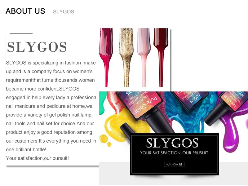 Brand Name: SLYGOS Type: Soak off UV&LED Nail Gel Polish Effect: Pure Color Quantity: 1pcs Capacity: 10ml Bottle Materials: black plastic bottle Warranty: 24 months Certificate: SGS,MSDS
