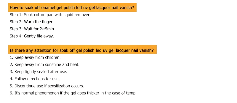 On like polish, wears like Gel, off in minutes Long lasting for at least 2-3 weeks,fantastic and super bright nails for you Environment-friendly products with healthy ingredient, low smell, NON-TOXIC, wide selection of colors Cure under LED/UV nail lamp. Average for LED lamp 30-60 secs, UV lamp 2-4min Ideal for professional salon beauty shop or at home personal use.