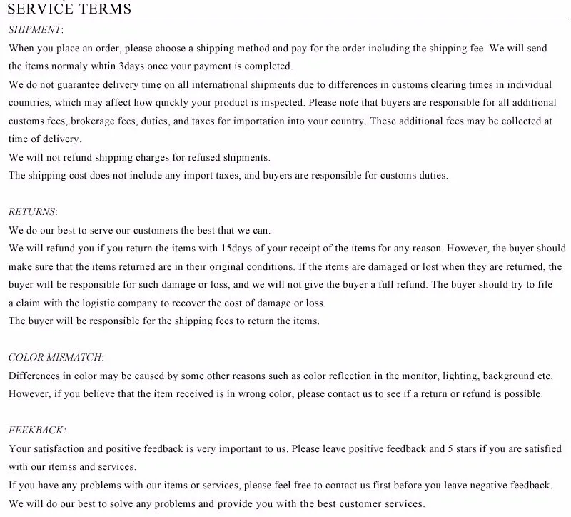We will respond in 24 hours and send out order in 5 working days. This is a big promotional product. So we choose the ordinary delivery,no tracking information. Under normal circumstances, the arrival time about: 35--60 days. If you require fast delivery, you can choose other faster shipping methods when placing your order.