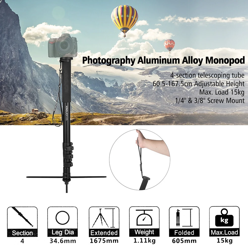 Модель выполнена из 4 секции телескопической трубки дизайн и 60,5-167,5 см/2-5.5ft с регулировкой по высоте, монопод идеально подходит для съемки на открытом воздухе, для путешествий, занятий спортом и т. д.