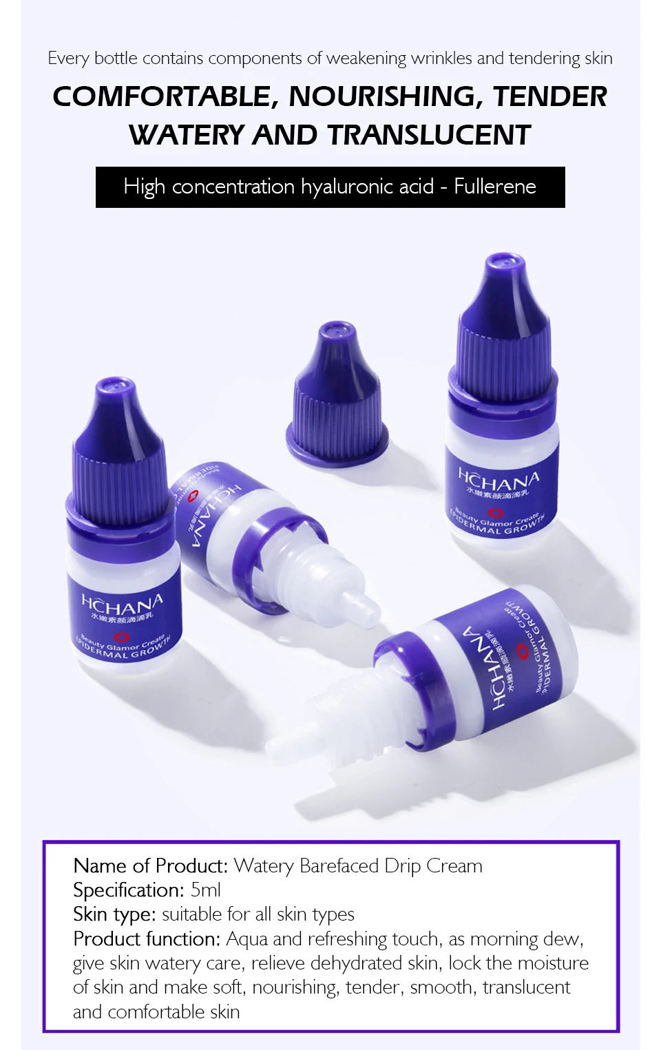 Каждая бутылка содержит компоненты ослабления морщин и тендерной кожи Удобные, питательные, нежные, водонепроницаемые и полупрозрачные Высокая концентрация гиалуроновой кислоты фуллерен Способ применения капельной эмульсии Слегка прижмите крышку Остановить скрытый затвор Нажмите вниз крышку и поверните и скрутите крышку Выдавите необходимое количество Нанесите его по текстуре лица и поглотите