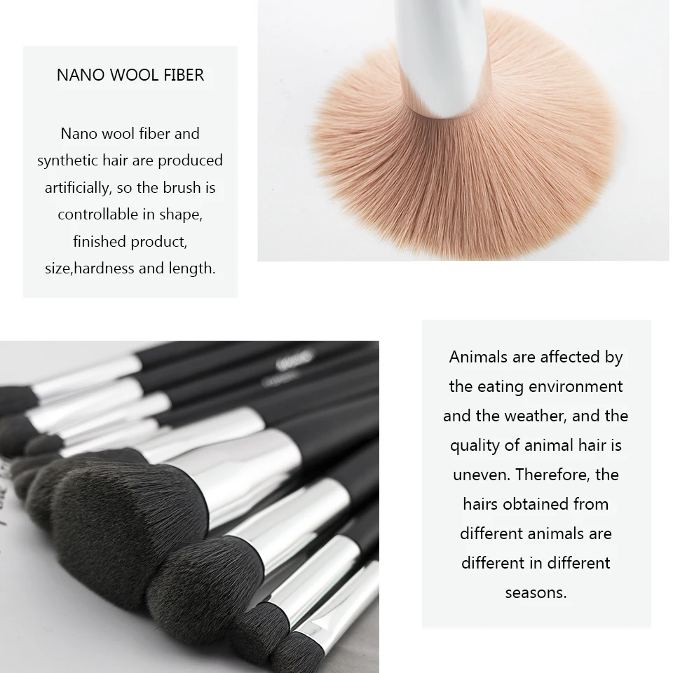 Artificнано-Шерстяное волокно и синтетические волосы производятся искусственно, поэтому кисть контролируется по форме, готовому изделию, размеру, твердости и длине. Animals на животных влияет питательная среда и погода, а качество волос животных неровное. Поэтому волосы, полученные от разных животных, отличаются в разные сезоны.