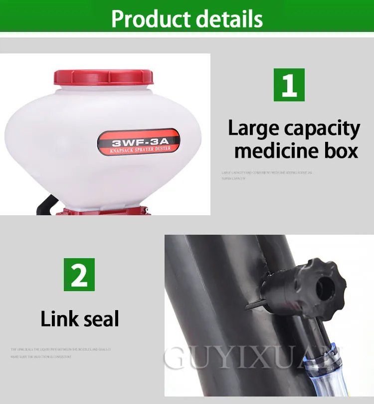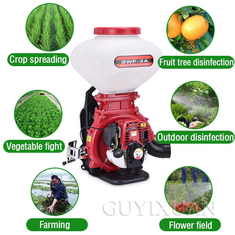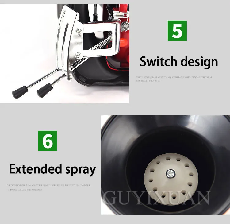 Бренд: GUYX Категория продукта: ранец с четырьмя смывными порошками многофункциональная машина Мощность: 3.0HP Емкость коробки для лекарств: 26 л Метод зажигания: CDI Модель питания: четыре пуансона, два пуансона Расстояние распыления: 8-12 м Материал крыльчатки: алюминиевый сплав Характеристики продукта: подходит для различных культур, фруктовых деревьев, борьбы с вредителями