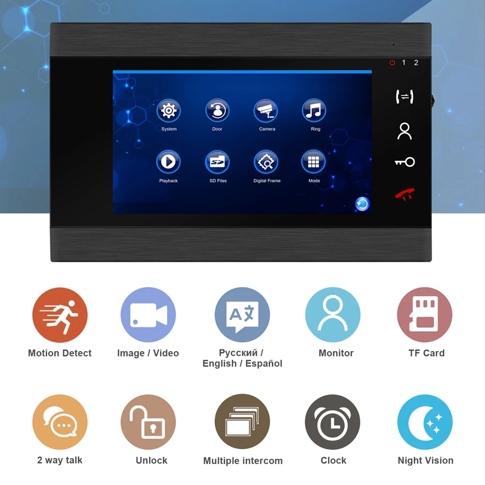 1. Функция обнаружения движения 2. Запись видео/изображения на карту памяти (до 32 ГБ) 3. Доступно для контроля снаружи без нажатия кнопки вызова 4. Разговаривайте с посетителями, также Поддерживайте несколько подключенных домофонов/видео разговоров 5. Поддержка подключения электронного замка 6. Поддержка аналоговой камеры 7. Поддержка английского/русского/испанского языков 8. Камера дверного звонка имеет инфракрасный Ночной Датчик 9. Настраиваемые мелодии звонка и продолжительность звонка 10. Часы или фото отображаются в режиме ожидания