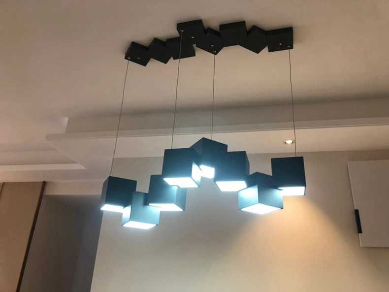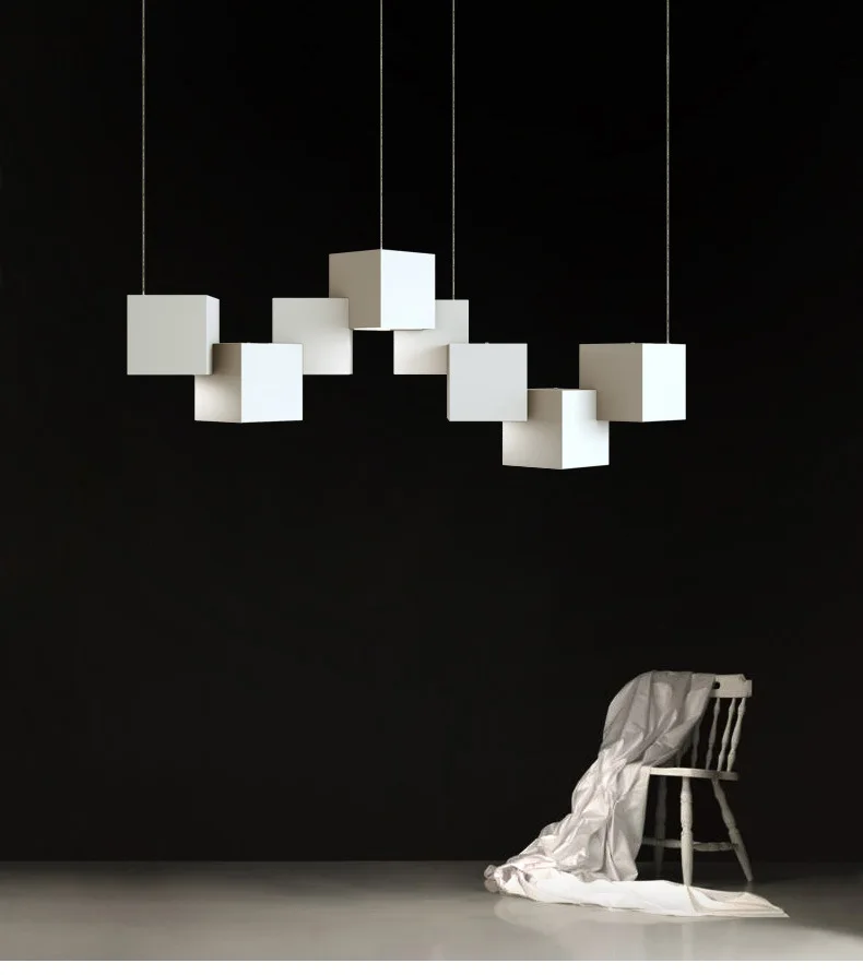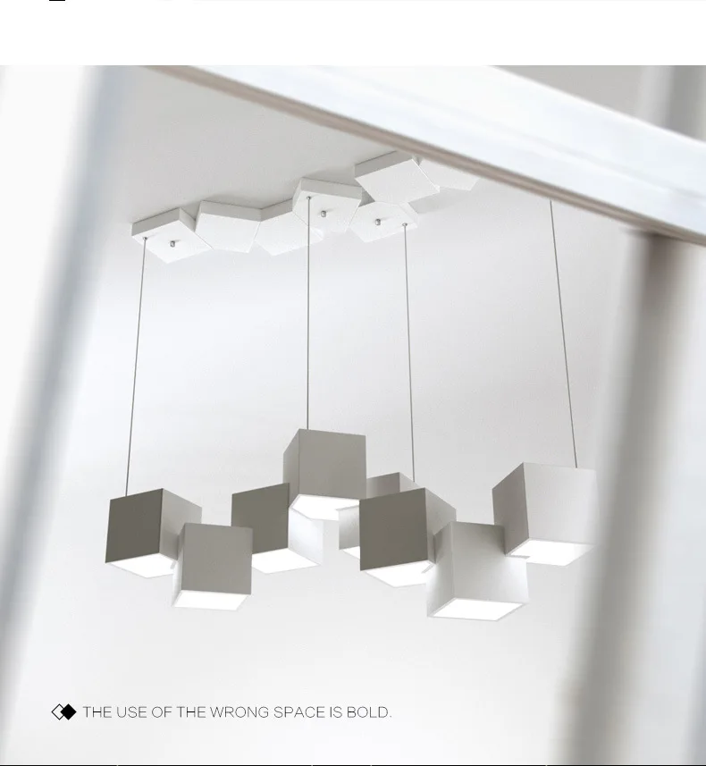 Это современный кубический потолочный кулон, окрашенный в матовые черные и белые цвета. Идеально подходит для подвешивания на обеденном столе или в маленьком холле.