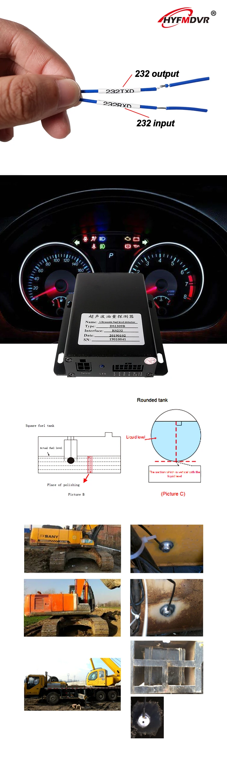 Модель продукта: HYF-UFQ8 Ультразвуковой детектор масла соединяет интерфейс RS232 MDVR, контролирует расход топлива автомобилей через программное обеспечение дистанционного мониторинга CMSV6, эффективно контролирует топливный бак и драйверы и приветствует сотрудничество клиентов.