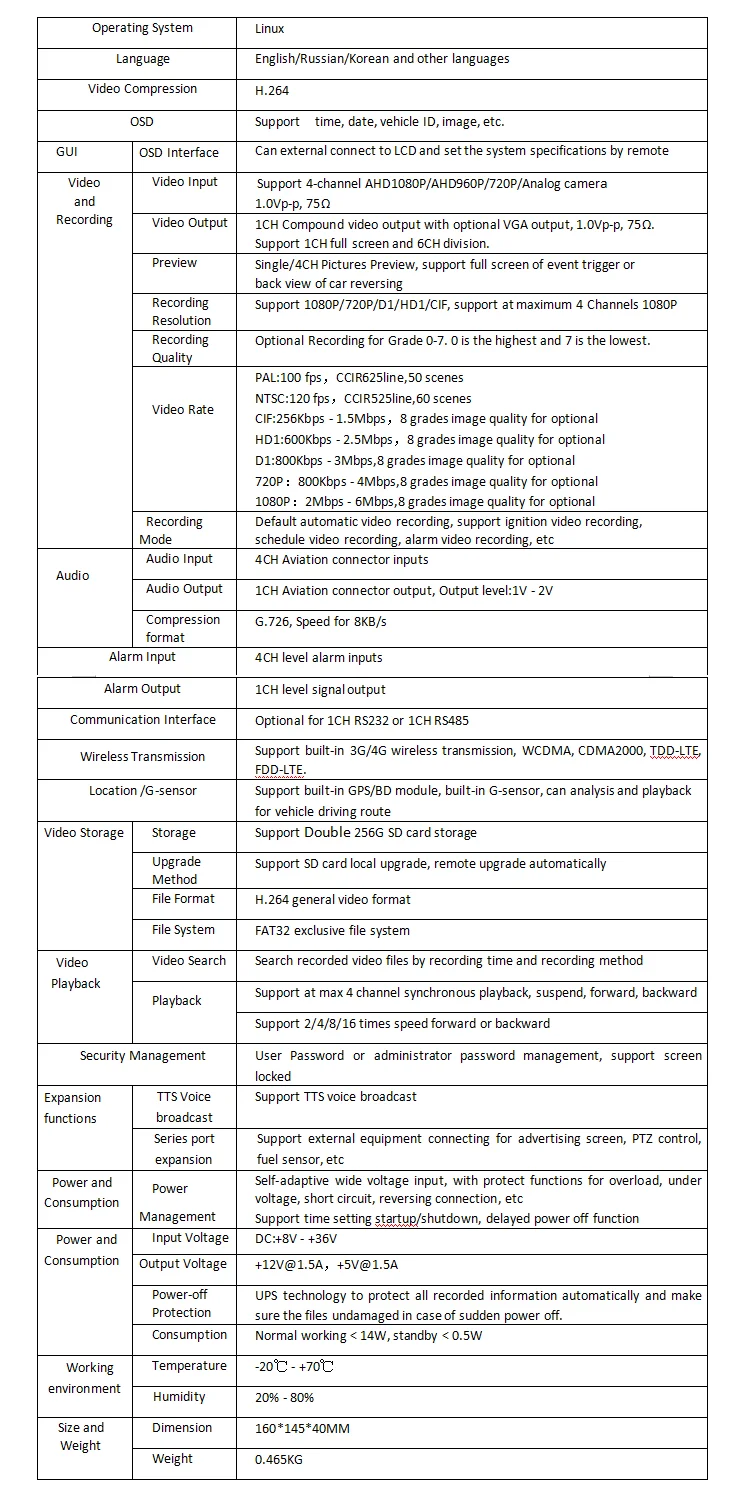 1. Поддержка 4 каналов аудиовхода, 4 канала записи видео в реальном времени; 2. Поддержка 4-канальный AHD1080P/AHD960P/720P/аналоговая камера 3. Рабочие языки: английский/русский/Корейский и другие языки 4. Операционная система: PAL/NTSC 5. Видео может быть наложено в режиме реального времени на Часы даты, номер транспортного средства, скорость, тормоз, сигнал тревоги 6. Автономный автомобильный широкополосный источник питания, стабильная работа в DC8V-36V диапазоне напряжения 7. Может установить время задержки видео, время задержки от 1 минуты до 244 минут, может установить низковольтную защиту 8. Автоматический сброс, так что машина никогда не разобьется, система может быстро восстановить видео после восстановления мощности, мгновенно выключить, не влияет на Записанные видеоклипы 9. Встроенный g-сенсор 10. Максимальная поддержка двойной 256G SD карты использовать видео; 11. Поддержка 4G GPS удаленного мониторинга и позиционирования Технические характеристики