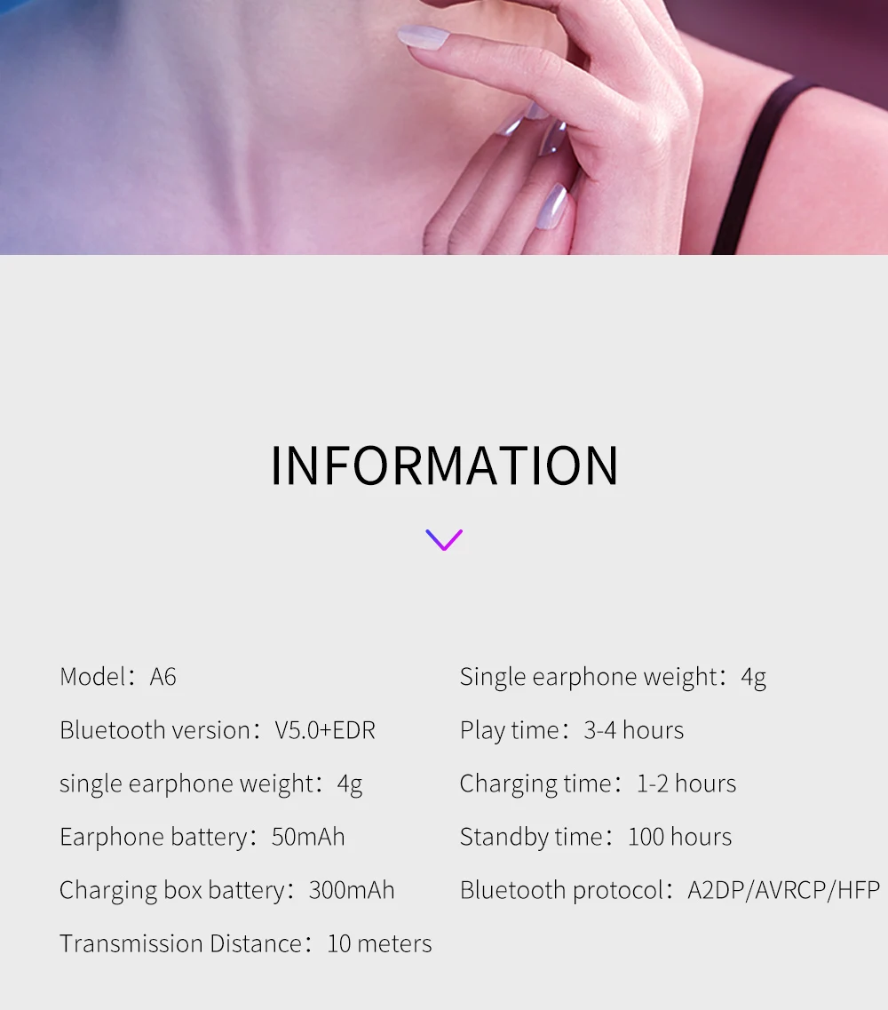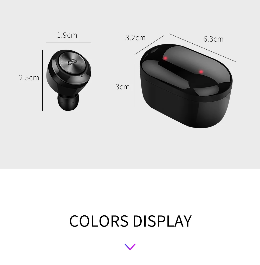 Особенности: 1. Пришло время для Bluetooth 5,0, совместимость и стабильность, были улучшены в несколько раз, чем старая версия Bluetooth. 2. Может автоматически подключаться и включаться после того, как вынимаете чехол для зарядки. 3. Беспроводное стерео, разделение левого и правого каналов, оба уха можно использовать отдельно. Параметры гарнитуры 1. Беспроводная версия: V5.0 + EDR 2. Драйвер: 8 мм 3. Сопротивление: 32 Ом 4. Используемый диапазон Bluetooth: 2,4 ГГц 5. Уровень мощности: класс II 6. Выходная мощность: 22 МВт 7. Расстояние Bluetooth: 10 метров барьер 8. Частотная характеристика: 20-20000 Гц 9. Диапазон рабочего напряжения: 3,0 V-4,2 V 10. Емкость аккумулятора (зарядный чехол): Внутренняя Аккумуляторная батарея 300 мАч 11. Емкость аккумулятора (вкладыши): Внутренняя перезаряжаемая батарея 50 мАч 12. Чехол для зарядки: 63 мм * 32 мм * 30 мм 11. Время разговора около 3-4 часов 12. Время прослушивания музыки около 3-4 часов 13. Время работы в режиме ожидания составляет около 100 часов Посылка: 2 x Мини Bluetooth наушники (левый и правый наушники, можно использовать отдельно) 1 x чехол для зарядки 1 х USB кабель для зарядки 1 x Руководство пользователя 4 x Бесплатная дополнительная крышка для ушей