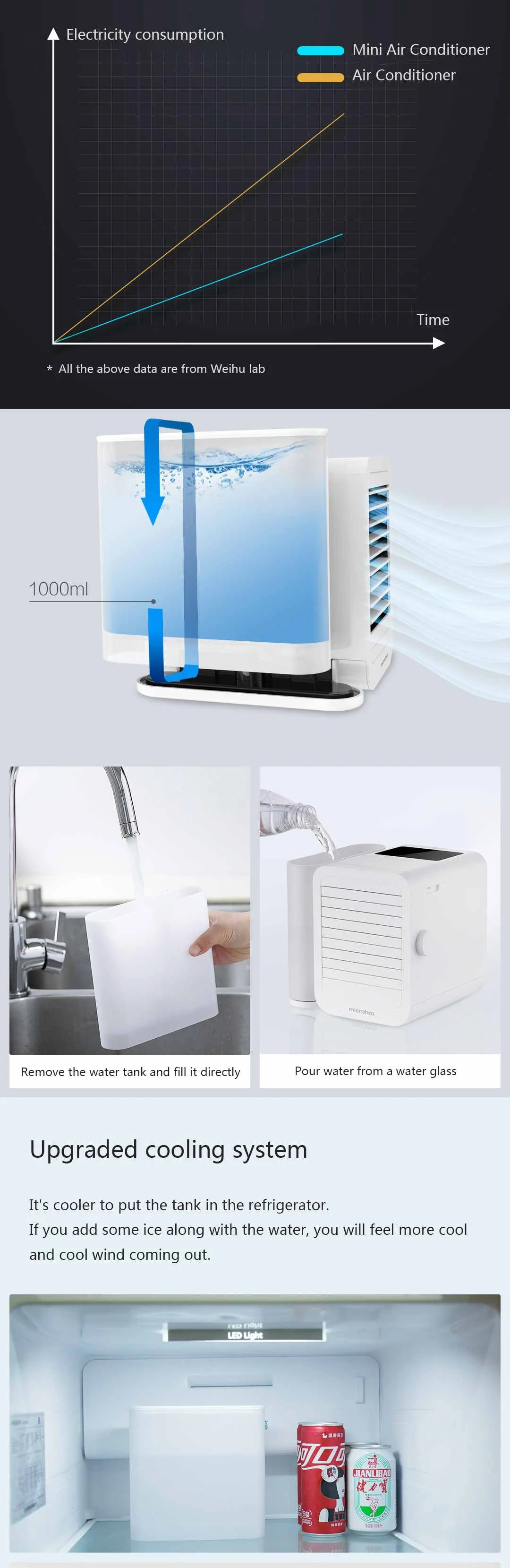 -Увлажнение и охлаждение ветра. он имеет большой резервуар для воды объемом 1000 мл, капель любимого эфирного масла в воду, туманный воздух выходит, чтобы увеличить влажность воздуха, очищает воздух и удерживает влагу кожи. Если вы добавите немного льда вместе с водой, вы почувствуете себя более прохладным и холодным ветром.