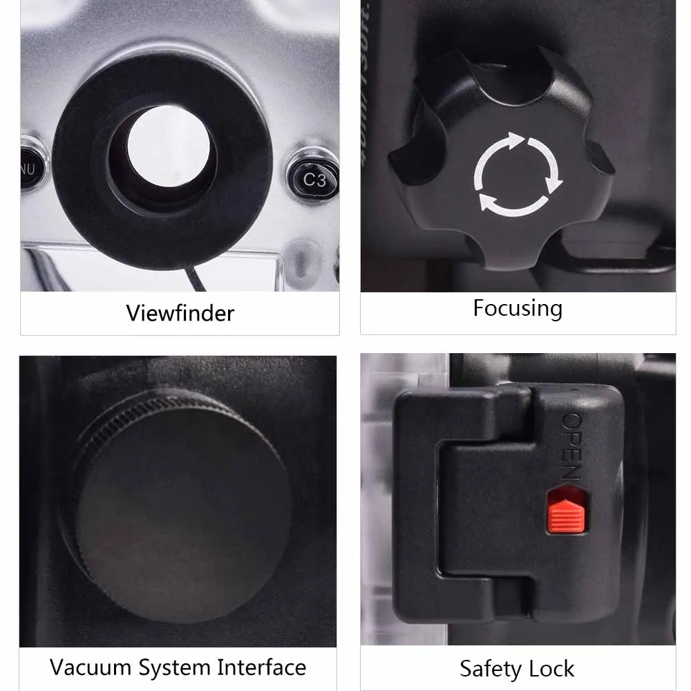 Порт системы вакуумного насоса Встроенный датчик обнаружения утечки Сменная портовая система Порт кабеля Synchro Стандартный плоский порт (оптическое стекло) 6 "сухой купол порт (оптический акрил) Съемная в виде пистолетной рукояткой с 2-х стадийной триггер (не прилагаются) Монтажная пластина из нержавеющей стали резьба 1/4"