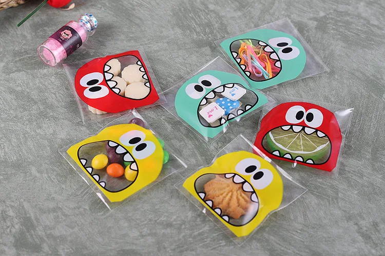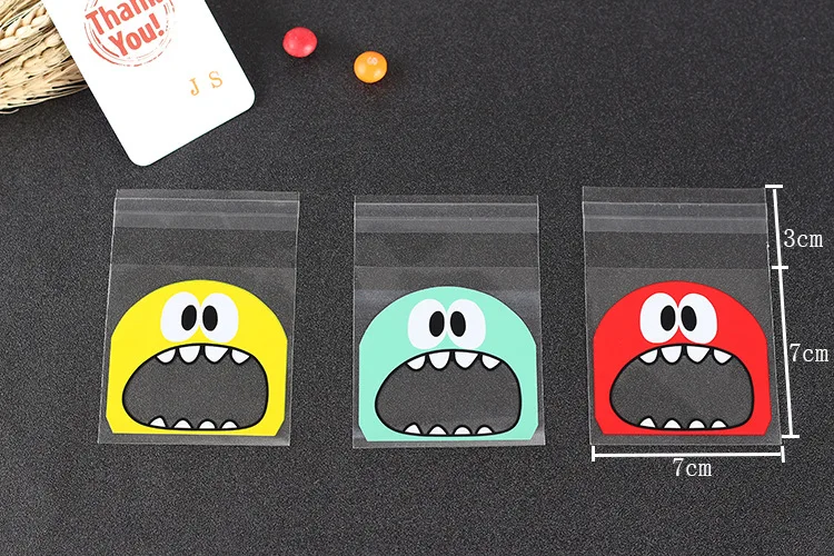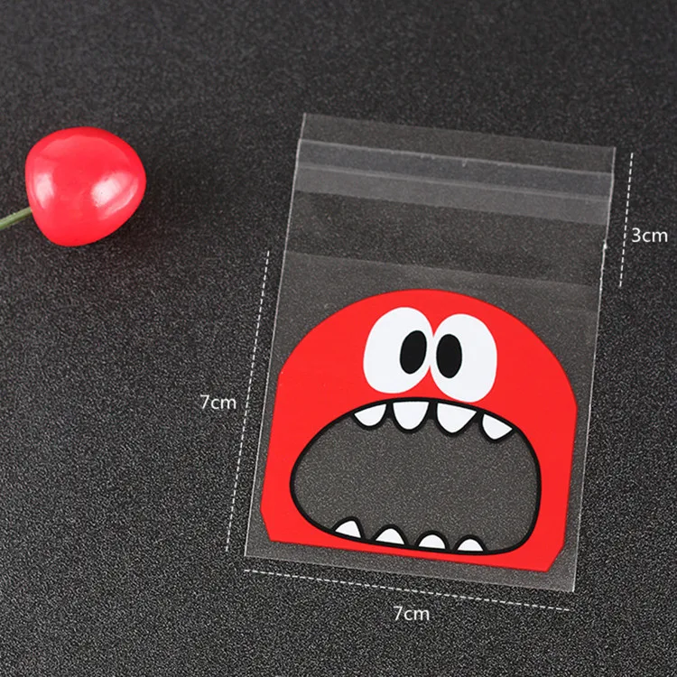 Особенности: 100% новые и высококачественные Размеры: 7*7 см + 3/10*10 + 3 см Материал: Пластик Цвет: розовый/зеленый/красный/желтый Вес: около 40g-90/упаковка Упаковка: 100 шт./упак. Функция: большая пасть чудовища самоклеящийся пакет DIY Инструменты для выпечки посылка милые печенья конфеты для упаковки пищевых продуктов, ювелирное изделие, подарок образец набор аксессуаров сумка, красивый и практичный