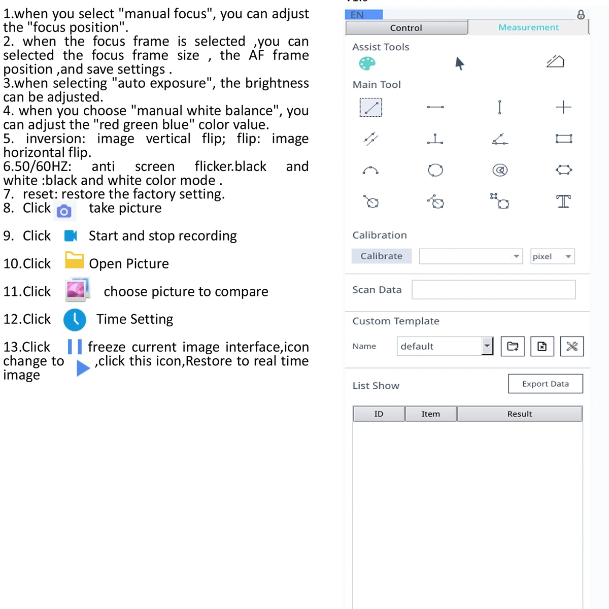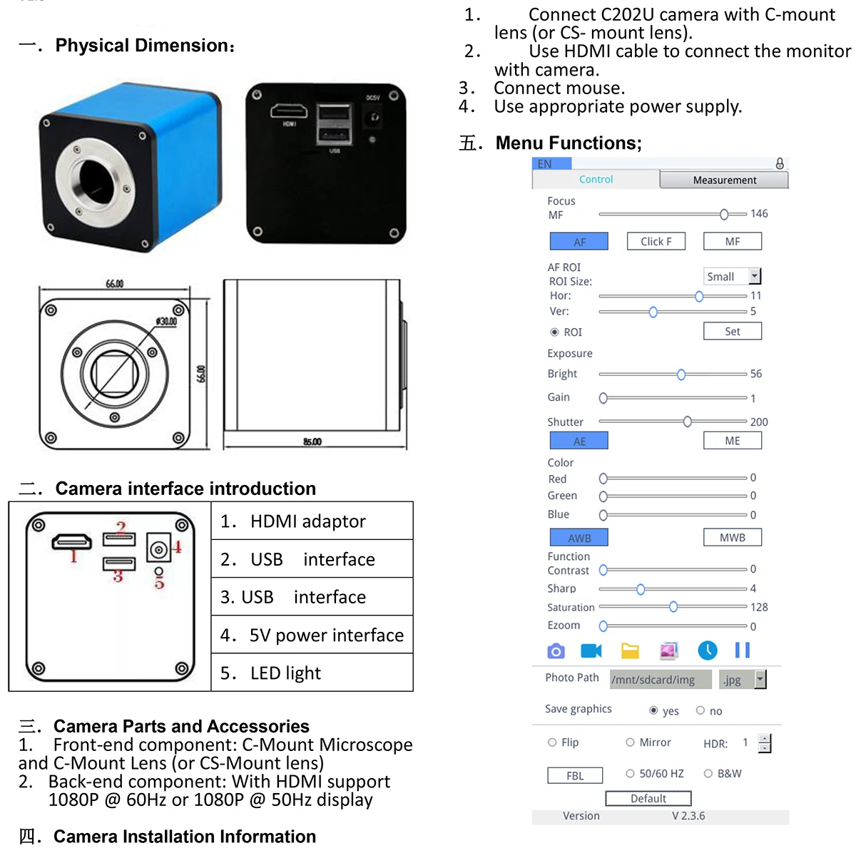 Характеристика:Высокоскоростная камера 1080P FULL HD 60FPSМЕНЮ дизайна пользовательского интерфейса, легко управлять мышьюАвтофокус, при наблюдении объектов различной высоты (максимум 10 см), вам не нужно регулировать рабочее расстояние объективаПри регулировке увеличения объектива вам не нужно регулировать рабочее расстояние объективаКогда вы регулируете рабочее расстояние объектива (макс. 10 см), вам не нужно регулировать увеличение объектива, камера может АвтофокусСпецификация:Сенсор: SONY IMX290Датчик изображения: Цвет CMOSРазмер пикселя: 1/2.8"Меню: полностью цифровой дизайн пользовательского интерфейсаСпособ работы: мышьИнтерфейс объектива: C/CS-typeМощность постоянного тока: DC5VМетод вывода: HDMIБаланс белого: Авто/Руководство/Управление одним нажатиемЭкспозиция: Автоматическая/ручнаяЧастота отображения кадров: 1080P @ 60 кадров в секундуМетод сканирования: линия по линии сканированияЗатвора Скорость: 1/50s(1/60s)-1/10000sРабочая температура: 0 C-50CУвеличение/увеличение: ПоддержкаФункция экономии: Поддержка u-диска или tf-карты (опционально)1. Перед подключением источника питания Подключите мышь к камере.2. В режиме AF программа автоматически настроит фокус, чтобы обеспечить четкое изображение; Переключение в режим «нажмите F», он будет блокировать фокус после того, как система осуществит автофокус на требуемом изображении; даже если изображение размыто, с блокировкой фокуса, оно не вызовет Автофокус снова; Когда «MF» (ручной фокус) установлен, MF можно отрегулировать.3. Если Автофокус не может работать при особых обстоятельствах (например, g. Гладкая отражающая поверхность). Переместите рамку фокуса к объектам с подробностями, измените режим «нажмите F» для выполнения однократного управления автофокусом или переключитесь в режим «MF» для ручной работы фокуса.4. Необходимо подождать некоторое время, когда будет выбрано «Сохранить изображение», значки будут отображаться в центре экрана и будут автоматически сохранены на U диск в формате jpg.5. При нажатии кнопки "видео" для начала записи,•Rec появится в правом нижнем углу экрана камеры. При повторном нажатии кнопки «Видео» Запись видео будет остановлена и автоматически сохранена на tf-карту с форматом H.2646. При сохранении изображения/видео папка и файлы будут называться соответственно по дате и времени.7. Когда вам нужно исправить задний фокус объектива, выберите «Мотор в середине», а затем Отрегулируйте механический задний фокус, чтобы сделать изображение чистым.Функция объективаРабочее расстояние: 100 мм-170 ммРазъем: Крепление CЗум: непрерывный переменный зумОбъективное Увеличение: 0.7X - 5X (около 10 - 200X на дисплее)Адаптер объектива окуляра: 0.4XФиксированное положение: 50 ммБлокировка: 0.7X - 5X БлокировкаВспомогательный объектив: 0.35X, 0.5X, 2X (опционально)Размер: 132 мм (L) * 55 мм (DIA)144 яркие белые светодиодный лампы
