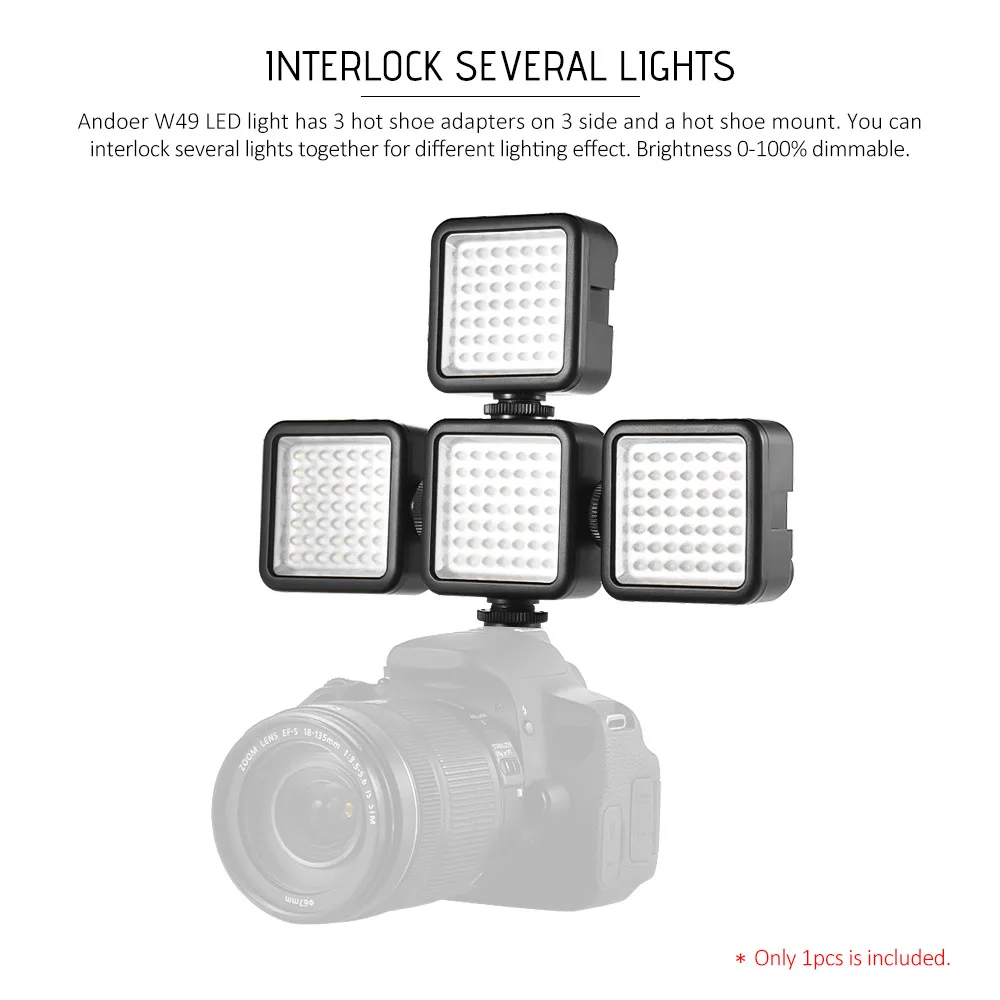 Мини светодиодный светильник Andoer W49 выдает максимум. 5,5 W мягкий белый светильник для профессиональной фотографии, например, для свадьбы, портретного изображения продукта и т. д. Светильник имеет 3 основания для горячего башмака для блокировки нескольких светильник s вместе для лучшего эффекта светильник ing. 0 - 100% Яркость затемнения.