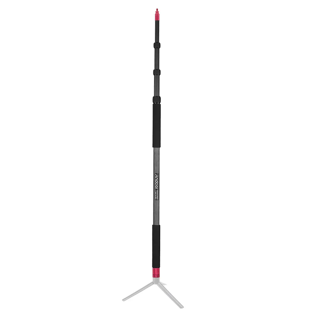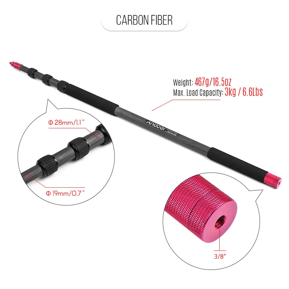 Andoer MK-3000 3 м/9,8 футов держатель микрофона изготовлен из твердого и легкого углеродного волокна. Стандартный винт 3/8 "подходит для большинства микрофонов и аксессуаров. Быстросъемный замок позволяет регулировать длину за считанные секунды. Провод можно спрятать во внутренней части полюса. Отверстие для винта в нижней части 3/8 дюйма позволяет установить его на мини-штатив.