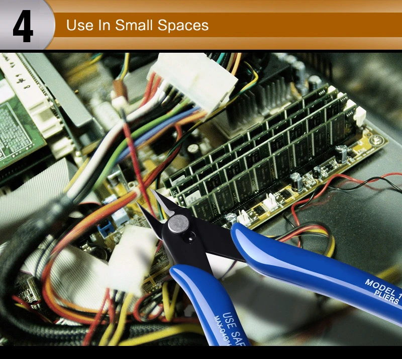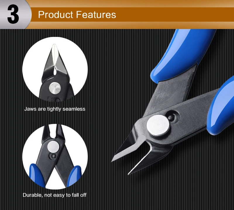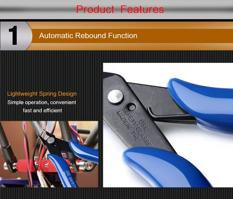 -Изысканно компактный, легкий и простой в обращении, общий вес составляет всего около 50 граммов. -Изысканный и удобный дизайн ручки, очень приятный на ощупь. Легкий пружинный дизайн позволяет легко открыть Укус и очень устойчив к усталости при использовании. -Научный косой рот разработан с плоским ртом и край ножа аккуратный и прочный. Можно аккуратно вырезать 0,1 мм тоньше, чем волосы. -Специальная высокоскоростная инструментальная сталь изготовлена с твердостью 57 градусов. Он может легко отрезать все виды мягкой проволоки ниже 1,6 мм и провод под 0,8 мм. -Он особенно подходит для резки проводов, электронных ножек, обрезки пластиковых деталей, резки небольших проводов и т. д. используется в электронной промышленности для ремонта, обработки ювелирных изделий, изготовления моделей и рыбалки.