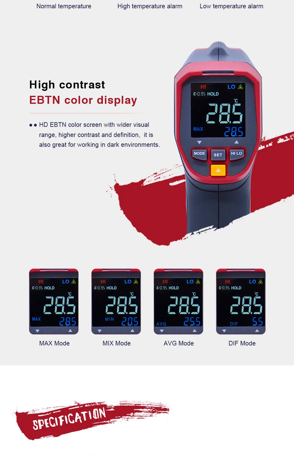 | Излучательная способность | 0,1 ~ 1,0 (регулируемый, сохраняет 5 наборов предустановленных значений) | ||