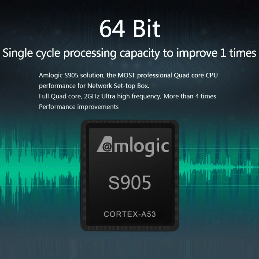 Поставляется с ОС Android 7,1, работает на Amlogic S905 Quad-core 64 бит Cortex-A53 Процессор, до 2,0 ГГц, в том числе, пятиядерный ГП Mail-450 GPU.