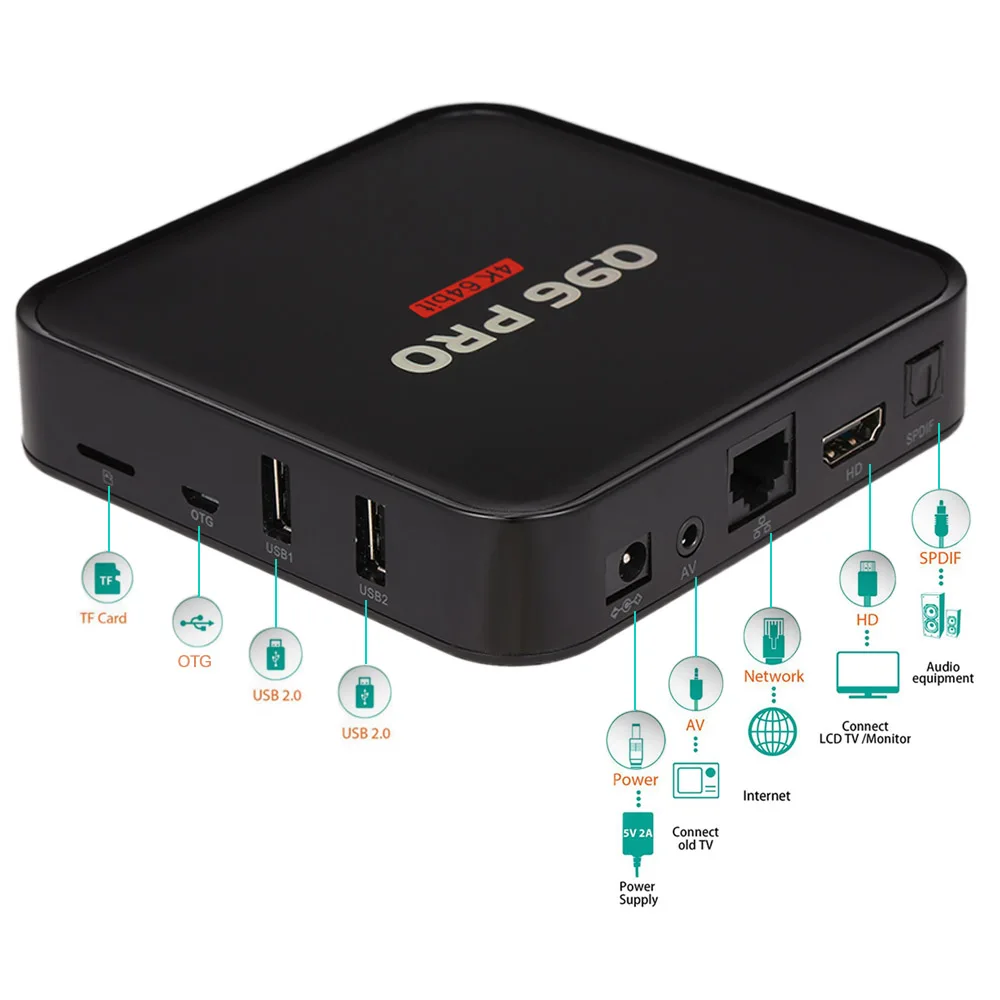 Q96 PRO Smart Android TV Box может изменить ваш традиционный телевизор и ЖК-монитор в мультимедийный центр, подключив интернет (через WiFi или RJ45). Эта умная ТВ-приставка Android принесет вам много удовольствия и удобства.