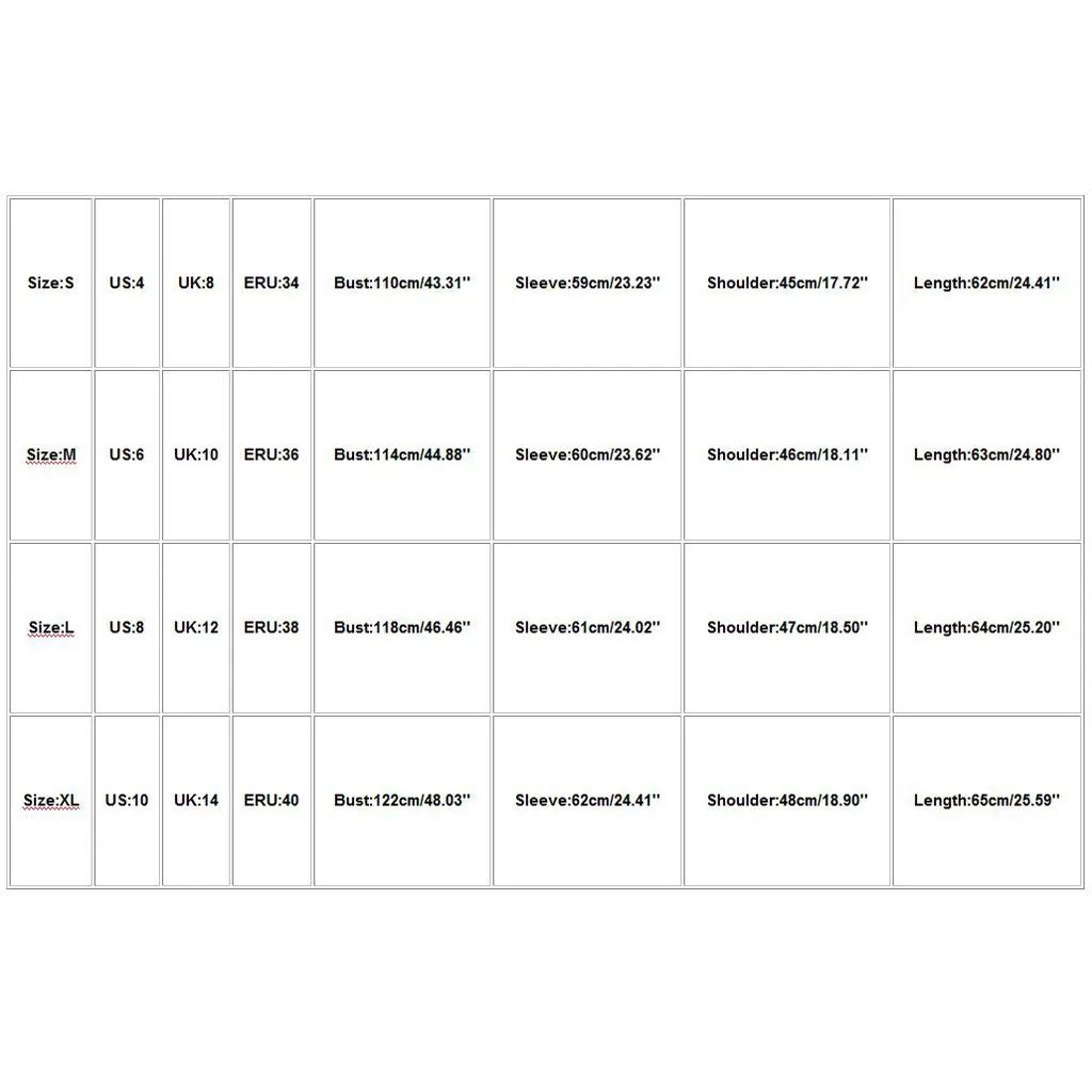 | Размер: XL | США: 10 | Великобритания: 14 | ЕСВ: 40 | Обхват груди: 122 см/48,03 дюйма | Рукав: 62 см/24,41 дюйма | Плечо: 48 см/18,90'' | Длина: 65 см/25,59'' |