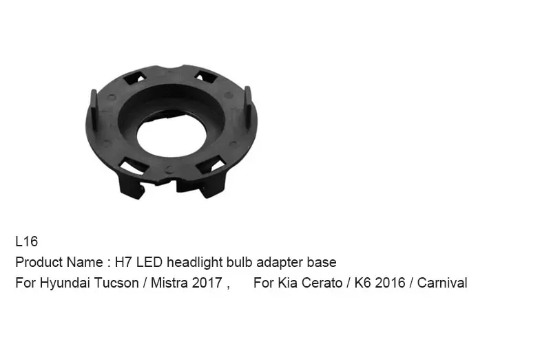 L16 Название продукта: H7 светодиодный адаптер для фар Для hyundai Tucson/Mistra 2017 Для Kia Cerato/K6 2016/карнавал Материал: АБС-пластик Размер: 55*26 мм/внутренний диаметр 23 мм