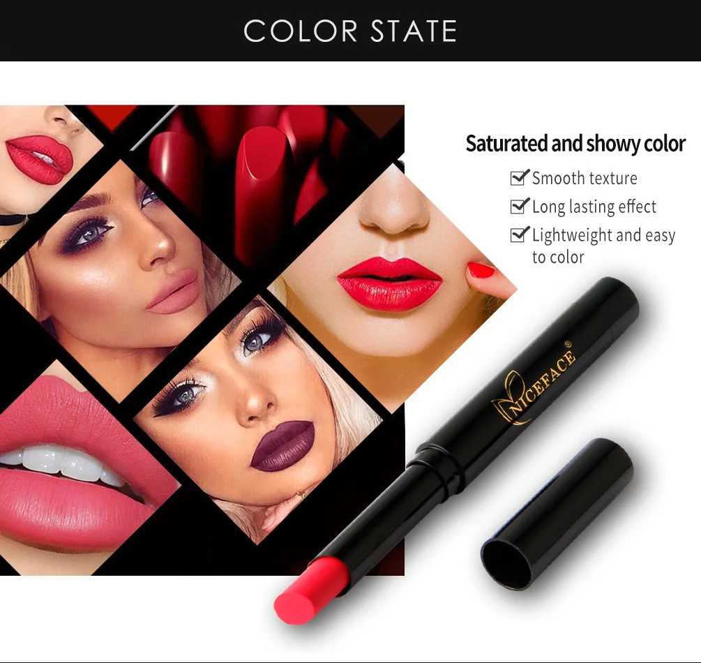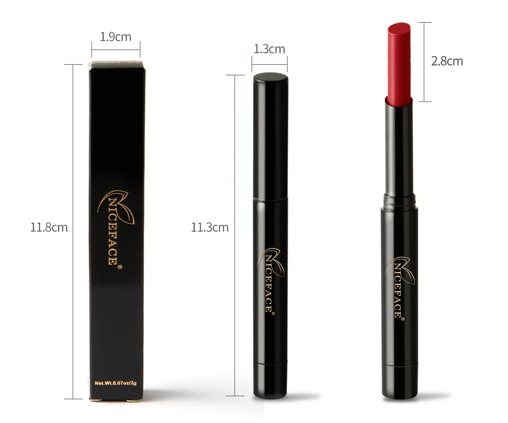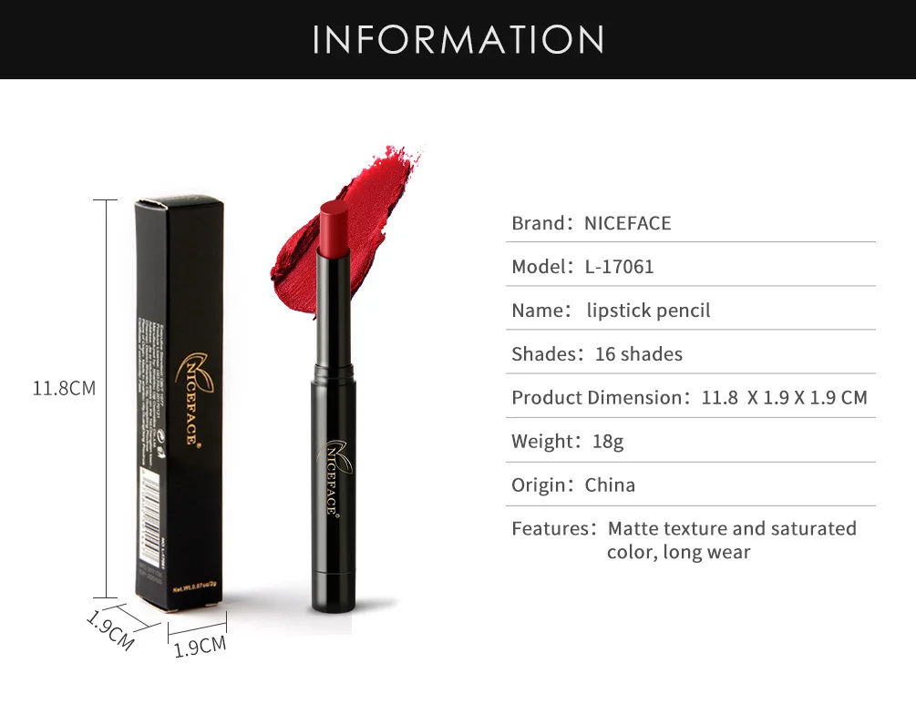 Бренд: NICEFACE Название: губная помада Цвет: 16 цветов Модель: L-18061 Вес: 18 г Происхождение: Китай Размер изделия: 11,8*1,9*19 см Подходящая кожа: для всех типов кожи Срок годности: 3 года Особенности: длинные, шелковистые формулы без усилий обеспечивают полное покрытие одним ходом Преимущества: 1. 16 цветов влажной текстуры, свежий и нежный цвет рендеринга 2. Стойкий эффект макияжа, добавляя здоровые увлажняющие ингредиенты,