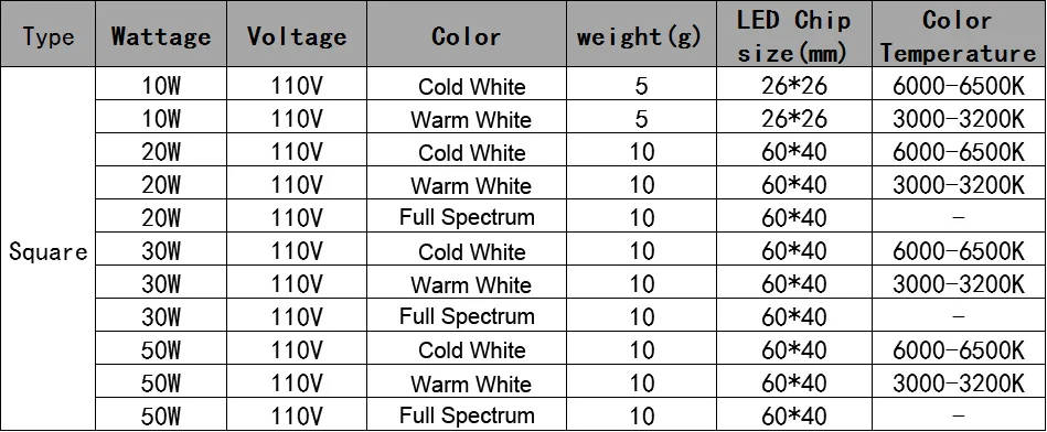 Особенности: Мощность: 20 Вт 30 Вт 50 Вт 70 Вт 100 Вт 150 Вт Напряжение: AC 110 В Цветовая температура: белый 6000-6500 K, теплый белый 2800-3200 K Угол луча: 180 градусов Срок службы: 10 000 часов Корпус Материал: Алюминий Полный спектр: можно использовать для выращивания растений, животноводства.