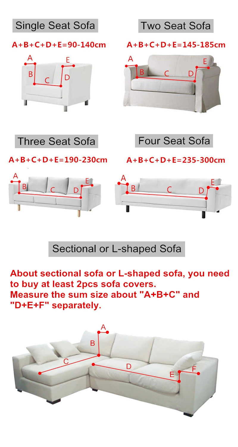 Размер крышки дивана (прибл.): 1 сиденье (90-140 см), 2 сиденья (145-185 см), 3 сиденья (190-230 см), 4 сиденья (235-300 см)