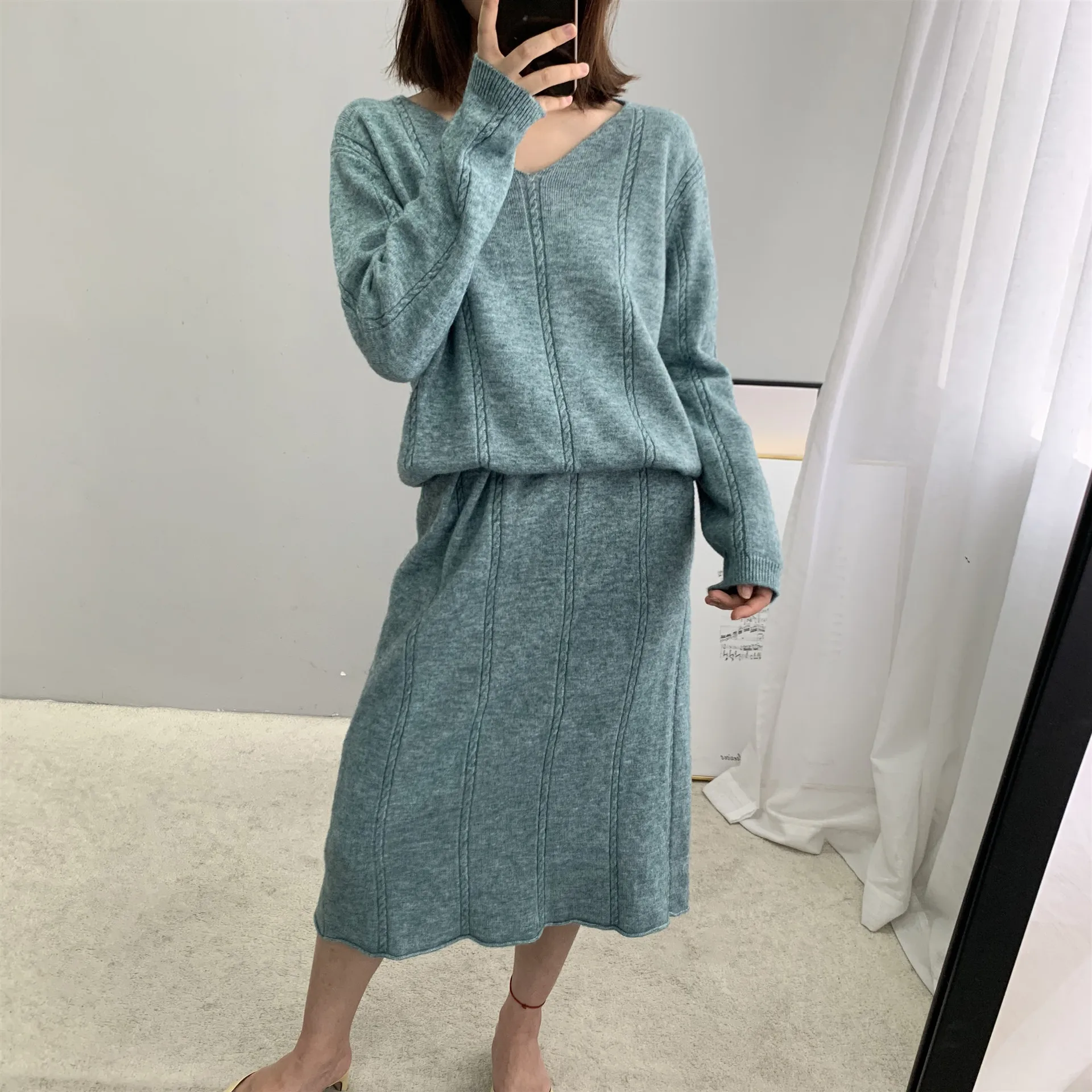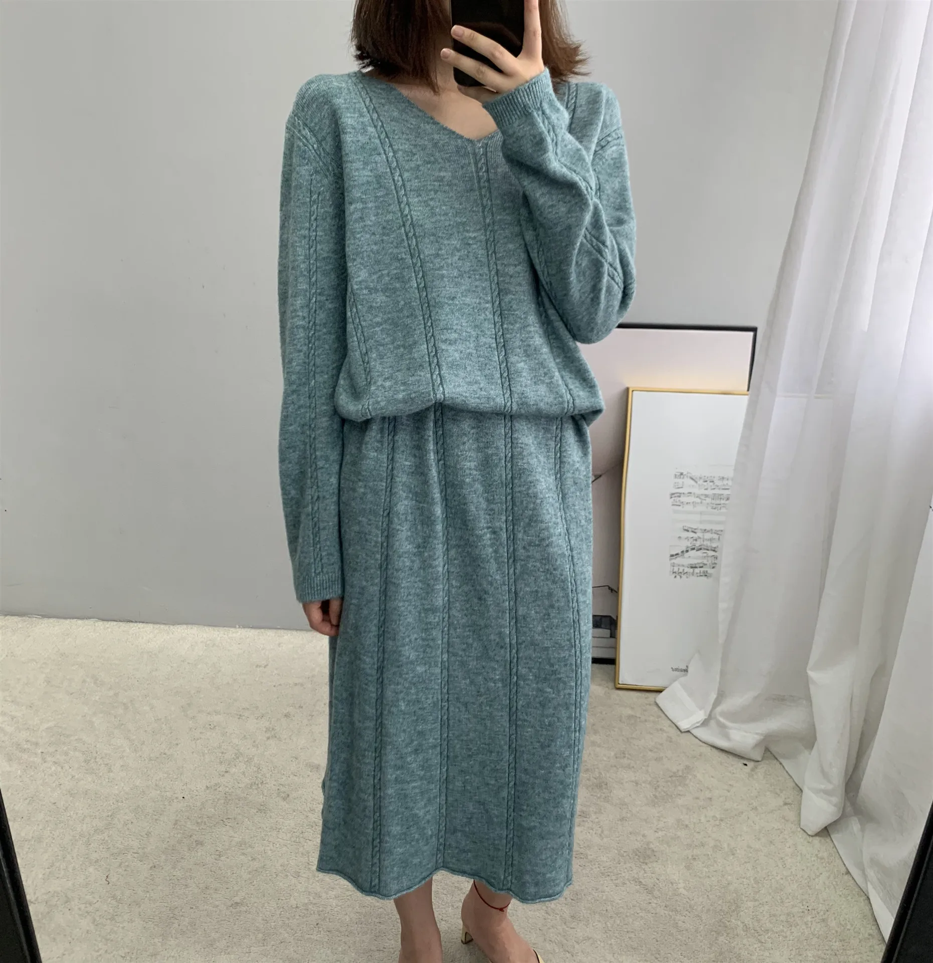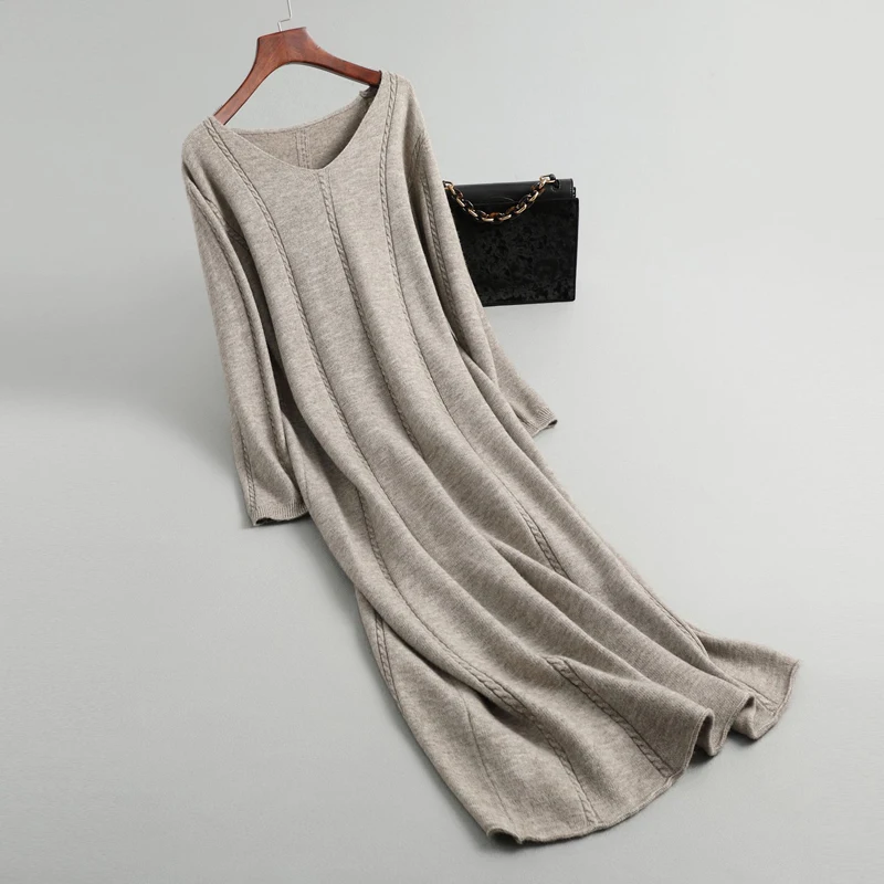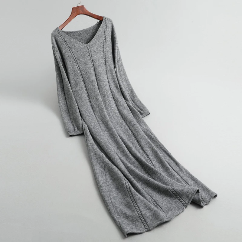 Зимние платья для женщин в стиле ретро, элегантное женское Шерстяное вязаное длинное шерстяное платье с v-образным вырезом и длинным рукавом, свободные вечерние платья vestidos