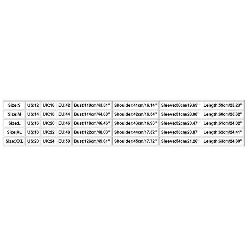 | Размеры: XXL | Свяжитесь с нами: 20 | Великобритания: 24 | ЕС: 50 | Бюст: 126 см/49,61 дюйма | Плечо: 45 см/17,72 дюйма | Рукав: 54 см/21,26 дюйма | Длина: 63 см/24,80 дюйма |