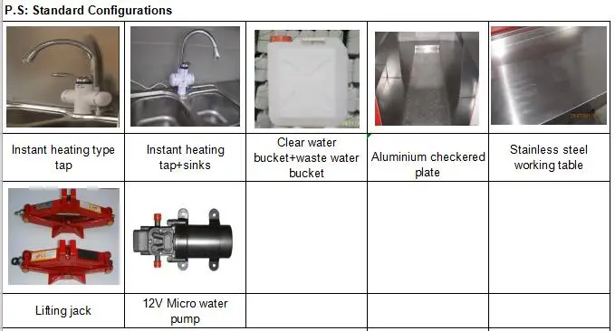 | Внутреннее оборудование | Рабочий стол из нержавеющей стали Двойная раковина для воды Счетчик Продажа окон Светильник 4-6 розеток Внешняя мощность suppl |