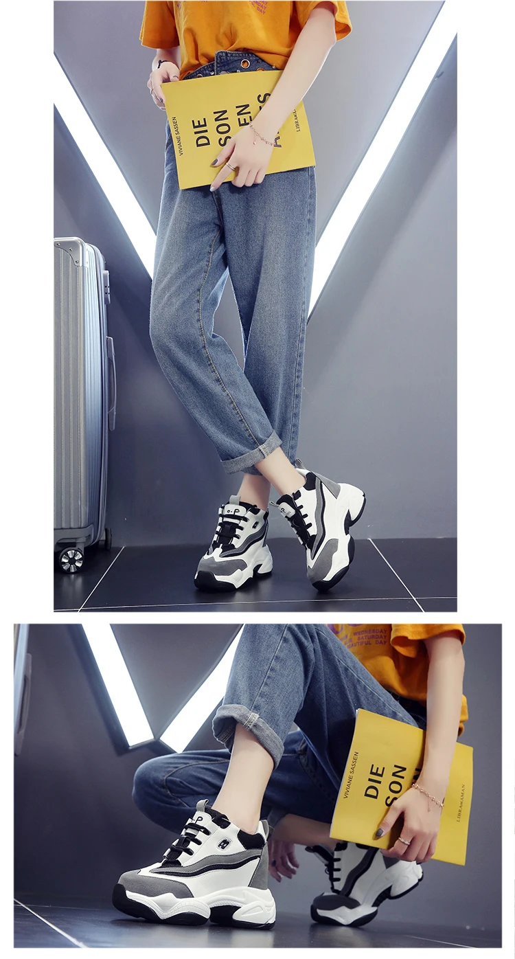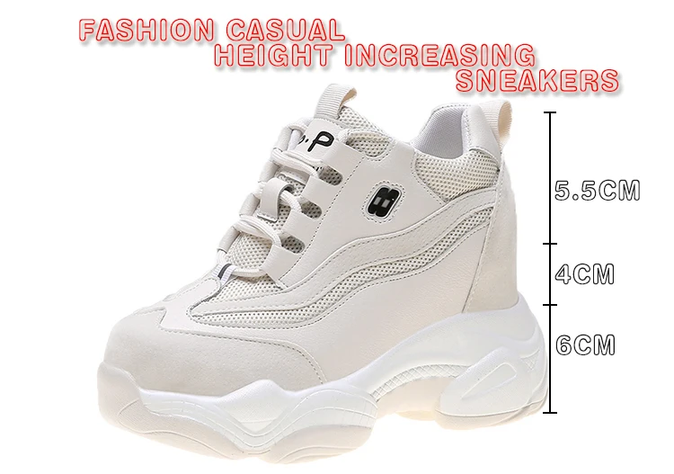 Осенняя обувь, увеличивающая рост; Женские спортивные кроссовки на платформе; Дышащая белая кожаная обувь на толстой подошве; Обувь на высоком каблуке 10 см