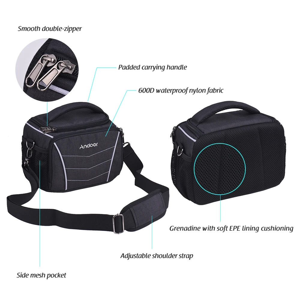 Стильная многофункциональная сумка через плечо для камеры Andoer. Стеганая ручка для переноски и съемный регулируемый наплечный ремень делают его как сумочку или одну наплечную сумку, которая предлагает несколько удобных способов переноски.