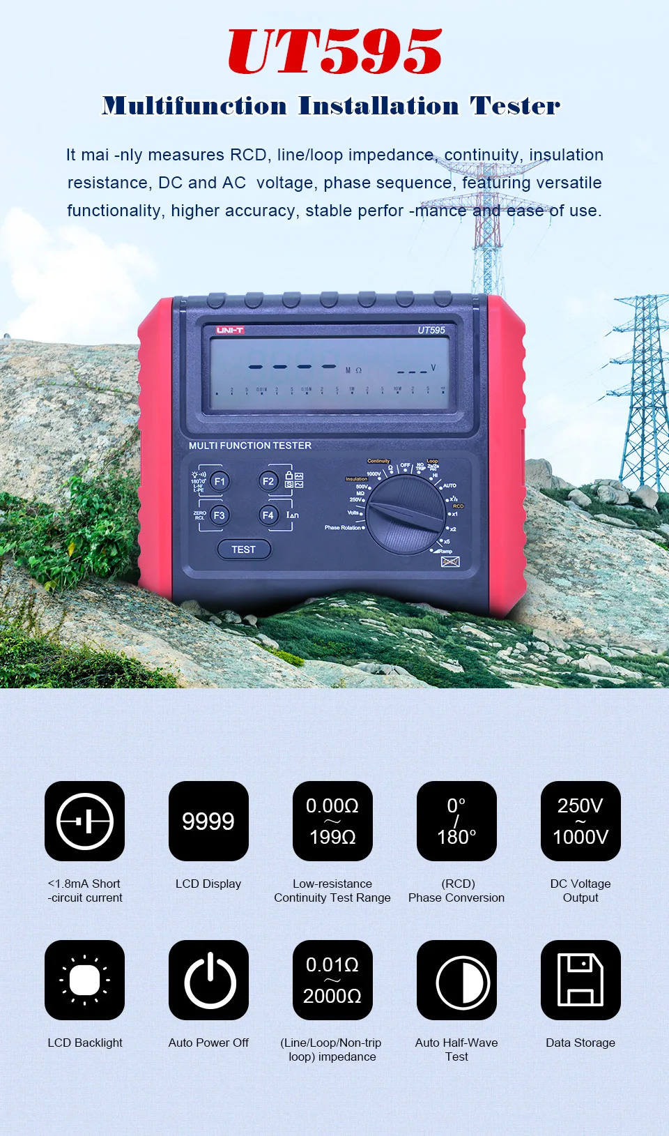UNI-T UT595 проверка сопротивления заземляющей линии, изоляционный Измеритель сопротивления, этапная последовательность/рампа RCD/испытание непрерывности низкого сопротивления