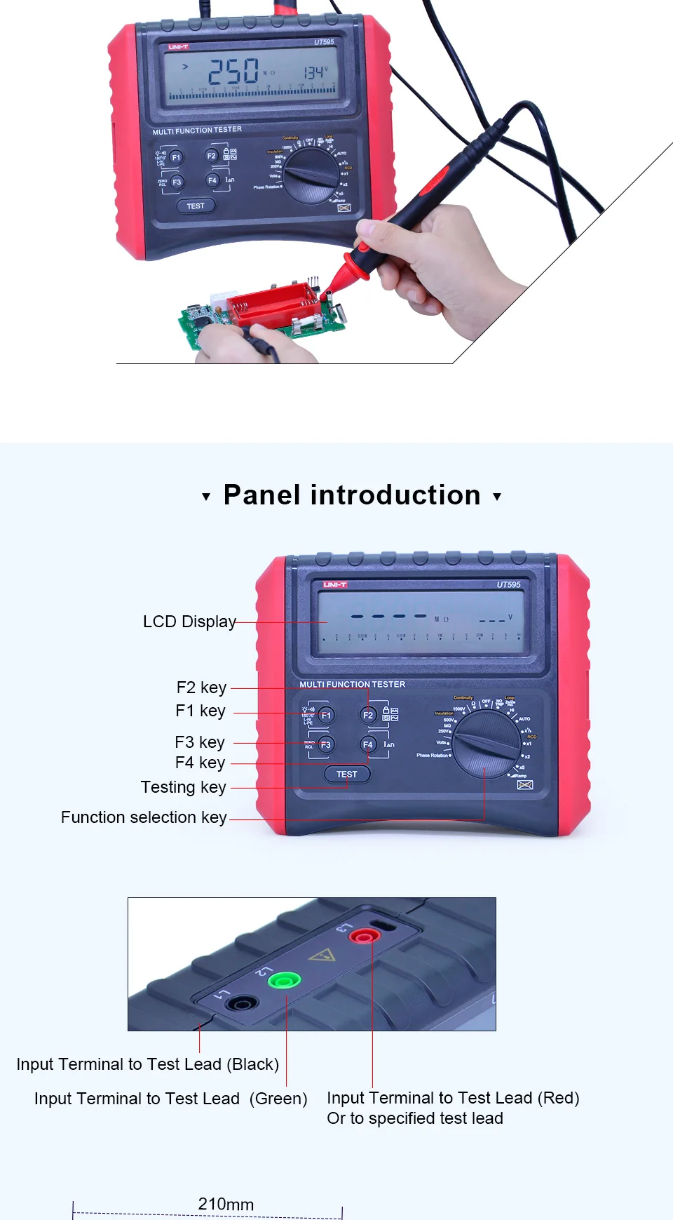 UT595-это своего рода комплексный цифровой многофункциональный инструмент для тестирования электробезопасности. В общем приборе используется новый дизайн, а также крупномасштабные Интегральные аналоговые схемы, цифровые схемы и микрокомпьютерные чипы. В основном используется для полного измерения параметров, включая защиту от утечки (RCD), контуру/сопротивление линий, проверку целостности заземления, сопротивление изоляции, напряжение постоянного тока, напряжение переменного тока и определение последовательности фаз; обладает большим количеством функций, более высокой точностью и стабильной производительностью, а также надежностью и удобностью в работе. Применяется для измерения защиты от утечки электроэнергии (RCD), измерения изоляции различных электрических устройств и проверки целостности заземления. UT595-ваш идеальный выбор для обслуживания, тестирования и проверки электрического протектора различных электрических устройств.