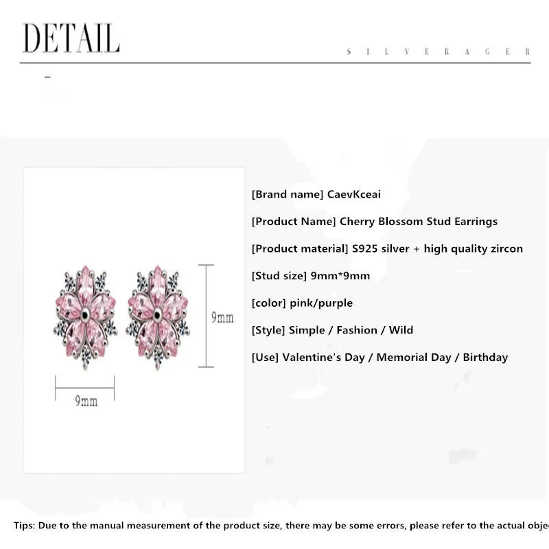 Название бренда: CaevKceai Наименование товара: серьги-гвоздики с цветком вишни Материал изделия: Серебро S925 + циркон высокого качества Размер стержня: 9 мм * 9 мм Вес: около 1,38 г Цвет: розовый/фиолетовый Стиль: простой/Модный/дикий Pckage: 1 пара серег-гвоздики с цветком вишни