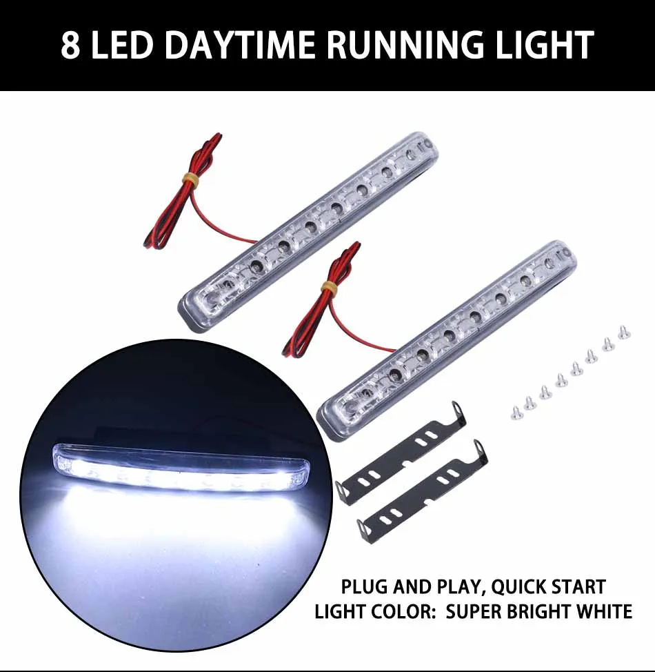 Особенности: 1. Универсальный модный стиль, подходит для всех автомобилей 12 в! 2. Супер яркий светодиодный, более эффективный, энергосберегающий, водостойкий, долговечный 3. Повышает безопасность вождения, подходит для дневного ходового светильник 4. Может использоваться с двух сторон передней или задней части автомобиля 5. Водонепроницаемый, пыленепроницаемый и ударопрочный, длительный срок службы 6. Обеспечивает лучшую видимость во время вождения ночью или даже в плохую погоду 8. Простота установки без изменения или изменения провода Спецификация: Номинальное напряжение: 12 В Ток: 0,4a Номинальная мощность: 8 Вт Высокий светильник: 10000-12000MCD Время работы: 50000-100000 ч Размеры: 15,5*1,5*4 см Посылка: 2x8 светодиодный светильник дневного света для автомобиля