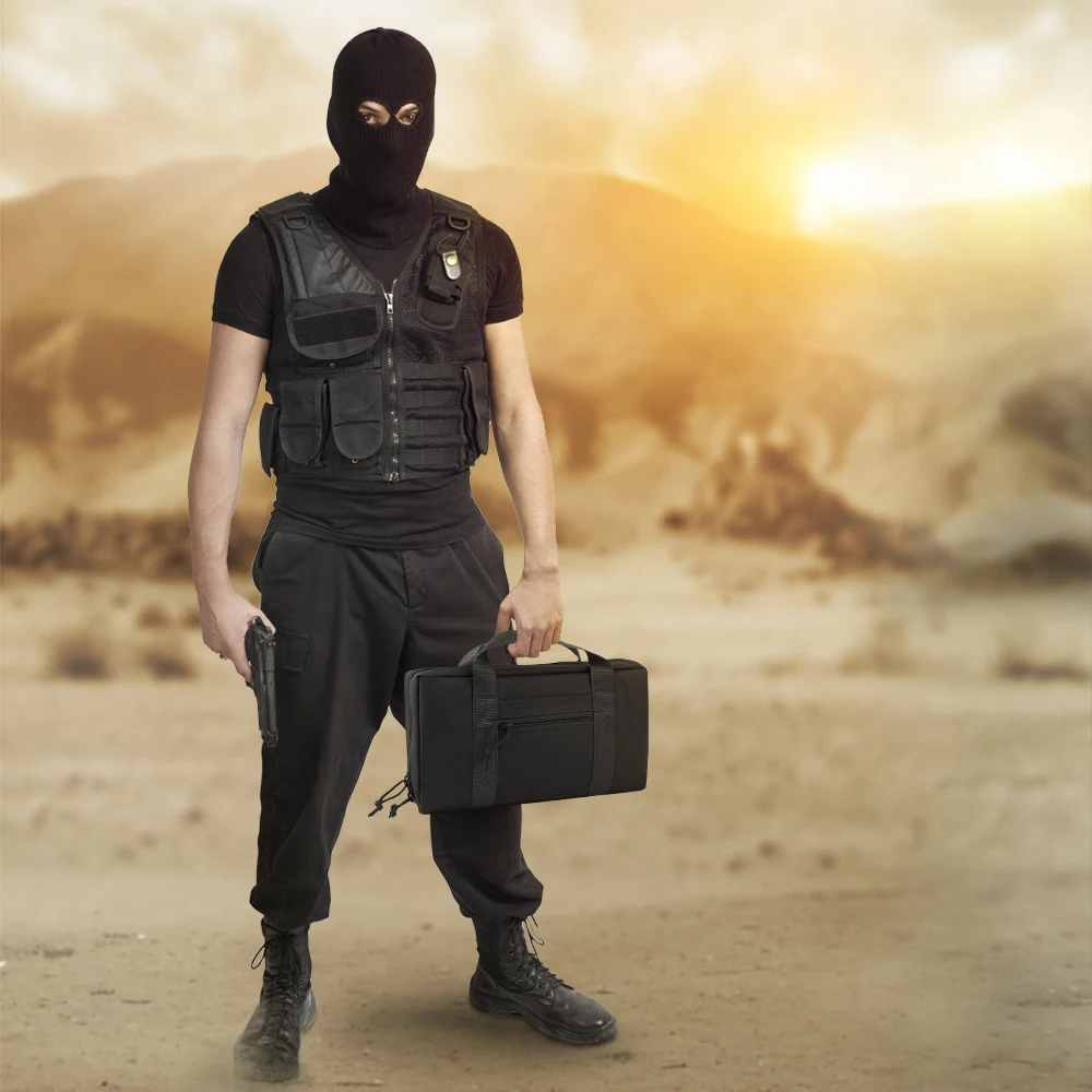 Изготовлен из нейлона высокой плотности 1000D Карман на молнии сзади 6 эластичных ремней для фонарей, тактических передач, журналов и т. д. (по 5 см) Одно пенное стеганое отделение с застежкой-молнией Конструкция поролона обеспечивает полную защиту вашего пистолета Два цвета могут быть выбраны из
