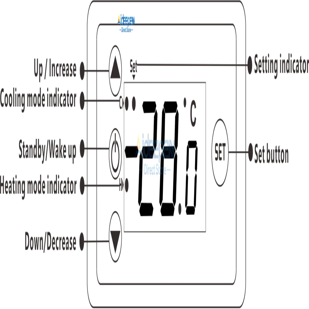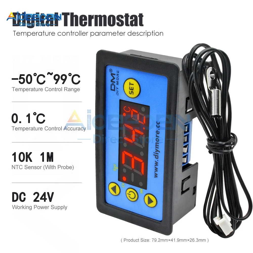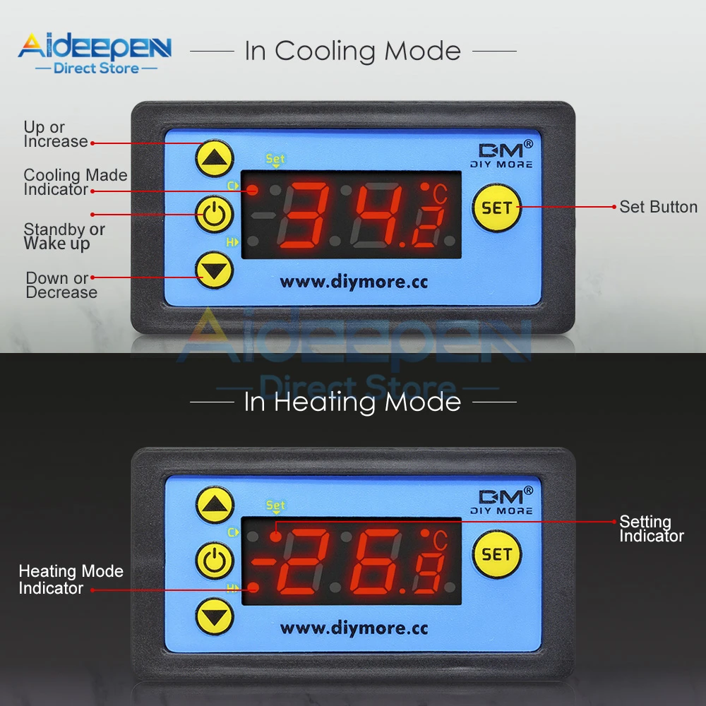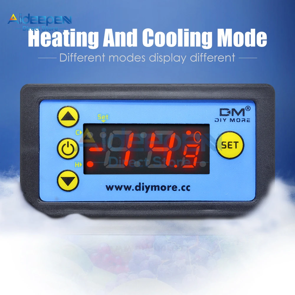 Характеристики: Диапазон контроля температуры: -55 °C ~ 120 °C/-67 °F ~ 248 °F Точность контроля температуры: 0,1 °C/0,1 °F Цвет дисплея: красный + синий Рабочий Источник питания: DC 12V DC 24V AC110V ~ 220V Датчик: NTC 10K 1 метр (с зондом) Размер изделия: 79,2 мм × 41,9 мм × 26,3 мм Размер отверстия: 72,1 мм × 39,2 мм Вес изделия: 52 г (12 В/24 В) ,59 г (110 В ~ 220 В) Руководство по эксплуатации: 1. Короткое нажатие «SET» маленькая цифровая трубка для вспышки, нажмите «△» или «▽» для установки целевой температуры, нажмите кнопку «режим ожидания» или не используйте, чтобы сохранить настройки в течение 3 секунд. 2. Нажмите и удерживайте кнопку «SET», чтобы войти в режим настройки кода, нажмите «△» или «SET», чтобы переключить код. После выбора нажмите «SET», чтобы ввести настройки кода. После настройки нажмите кнопку «режим ожидания» или не используйте, чтобы сохранить настройки в течение 3 секунд. 3. Последняя настройка параметров сохраняется по умолчанию после завершения работы. 4. Восстановите заводские настройки: Нажмите и удерживайте кнопку «SET» для включения. 5. Когда модуль включен, он начнет работать напрямую. После включения, нажмите и удерживайте кнопку «в режиме ожидания», модуль войдет в режим «сна» или «Пробуждение»; В чехол отключения питания, модуль будет работать автоматически после восстановления питания, не нужно начинать вручную. Примечание: Рабочее напряжение источника питания должно быть подключено в соответствии со стандартным напряжением этикетки, в противном случае модуль будет легко поврежден.