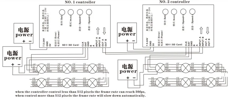 1. В тех случаях, когда T-1000S контроллер управления меньше, чем 512 лампы частота кадров может достигать 30fps. В тех случаях, когда T-1000S Управляйте более 512 лампами и менее 2048 лампами, частота работы будет автоматически замедляться.