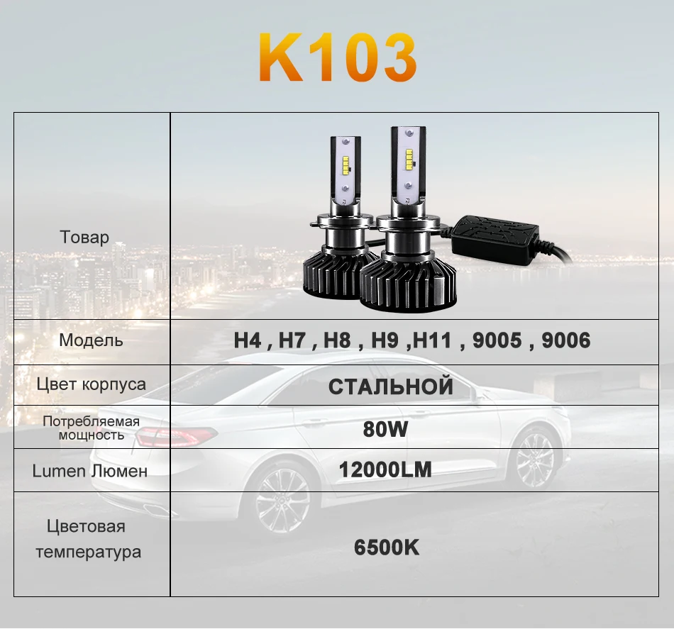 • Вход (A): A ± A • СВЕТОДИОДНЫЕ Чипы: 4 светодиодных чипа • Срок службы:> 30000 часов • Угол рассеивания света: 360 градусов, без слепых • Мощность: 80 Вт/комплект, 40 Вт/каждая лампа • Цветовая температура: 6500K • Люмен: L/6000лм, H/6000лм • Рабочее напряжение: 9-16 В постоянного тока • Рабочая температура:-40 °C ~ + 85 °C • Теория отвода тепла: авиационный алюминий 6063