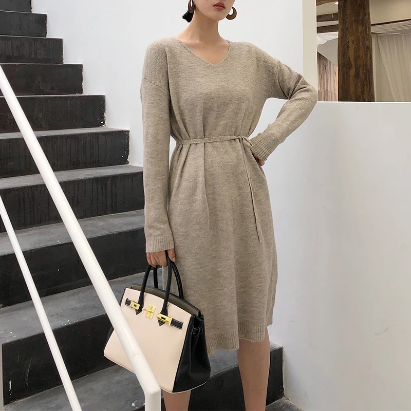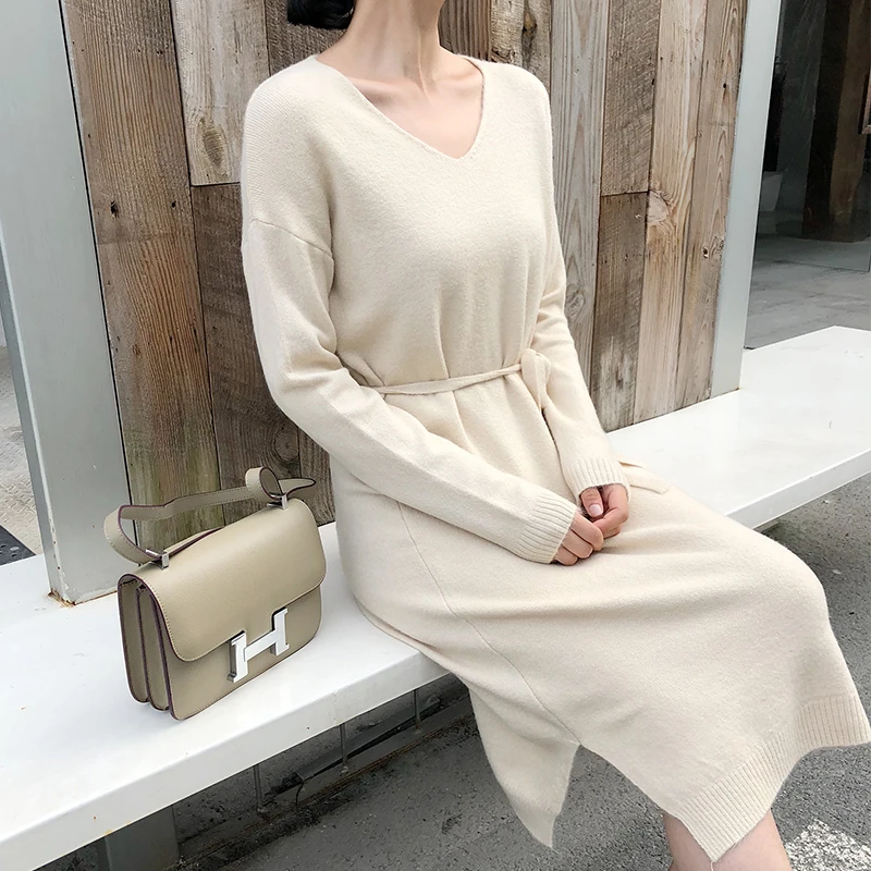 Длина до икры, удобное платье из трикотажной смеси кашемира. С поясом на талии. С v-образным вырезом, с открытыми плечами, с длинными рукавами, с разрезами по бокам.