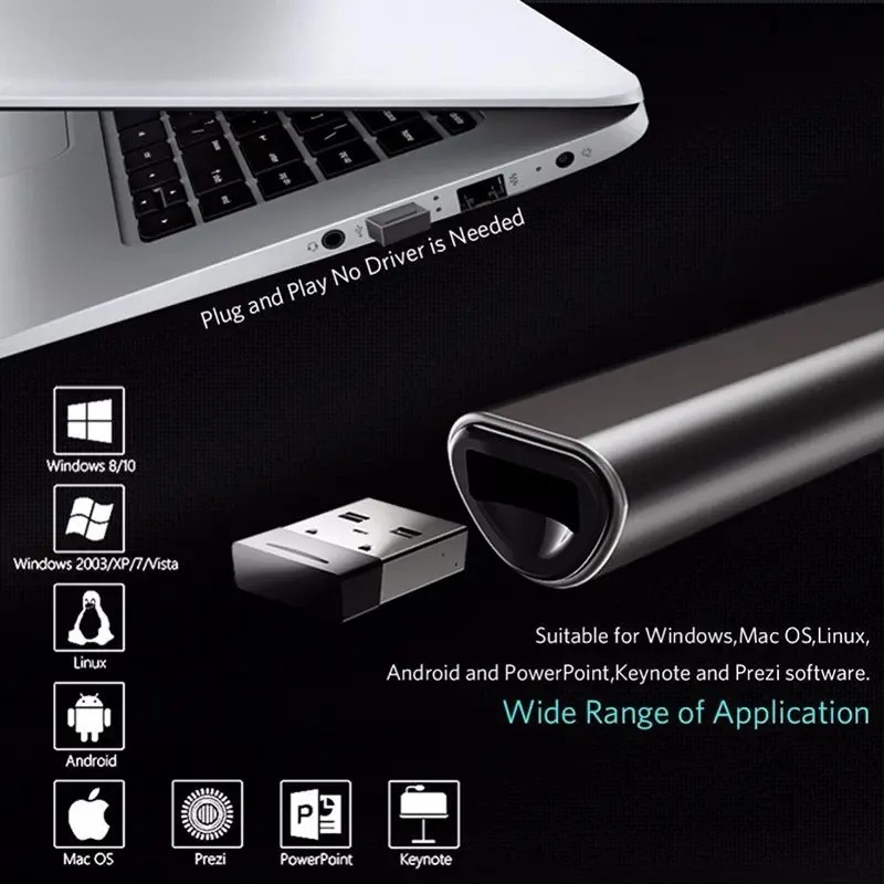 5. Демонстрационный указатель имеет низкую индикацию мощности; Интегрированный дизайн, мини-usb-приемник хранится в хвосте беспроводного передатчика, фиксируется на месте через магнитную систему.
