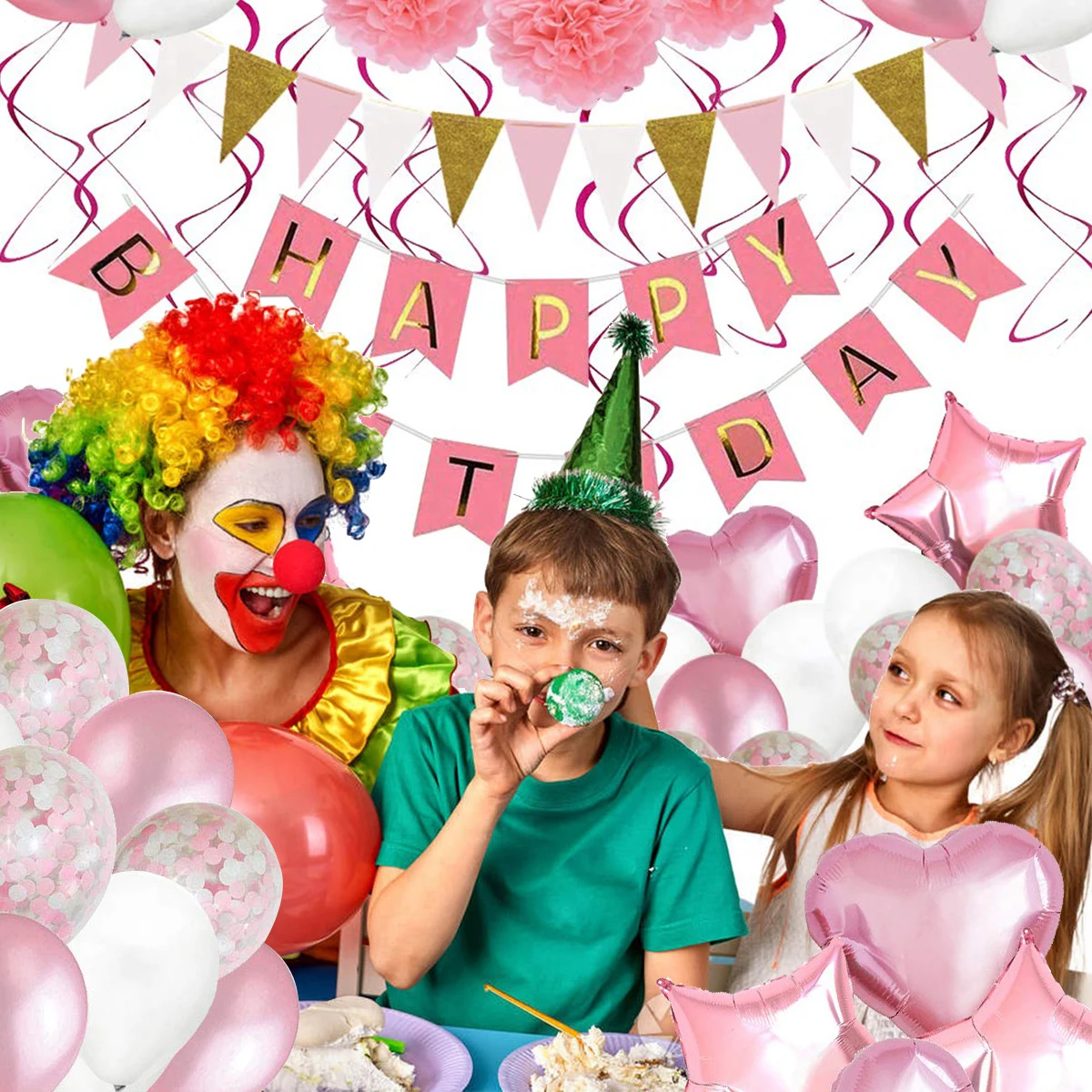 1. This kit includes 30pcs latex balloons, 6pcs paper pompom flowers, 5pcs swirls, 1pc happy birthday banner, 1pc triangular flags banner, 2pcs star foil balloon and 2pcs heart foil balloons.