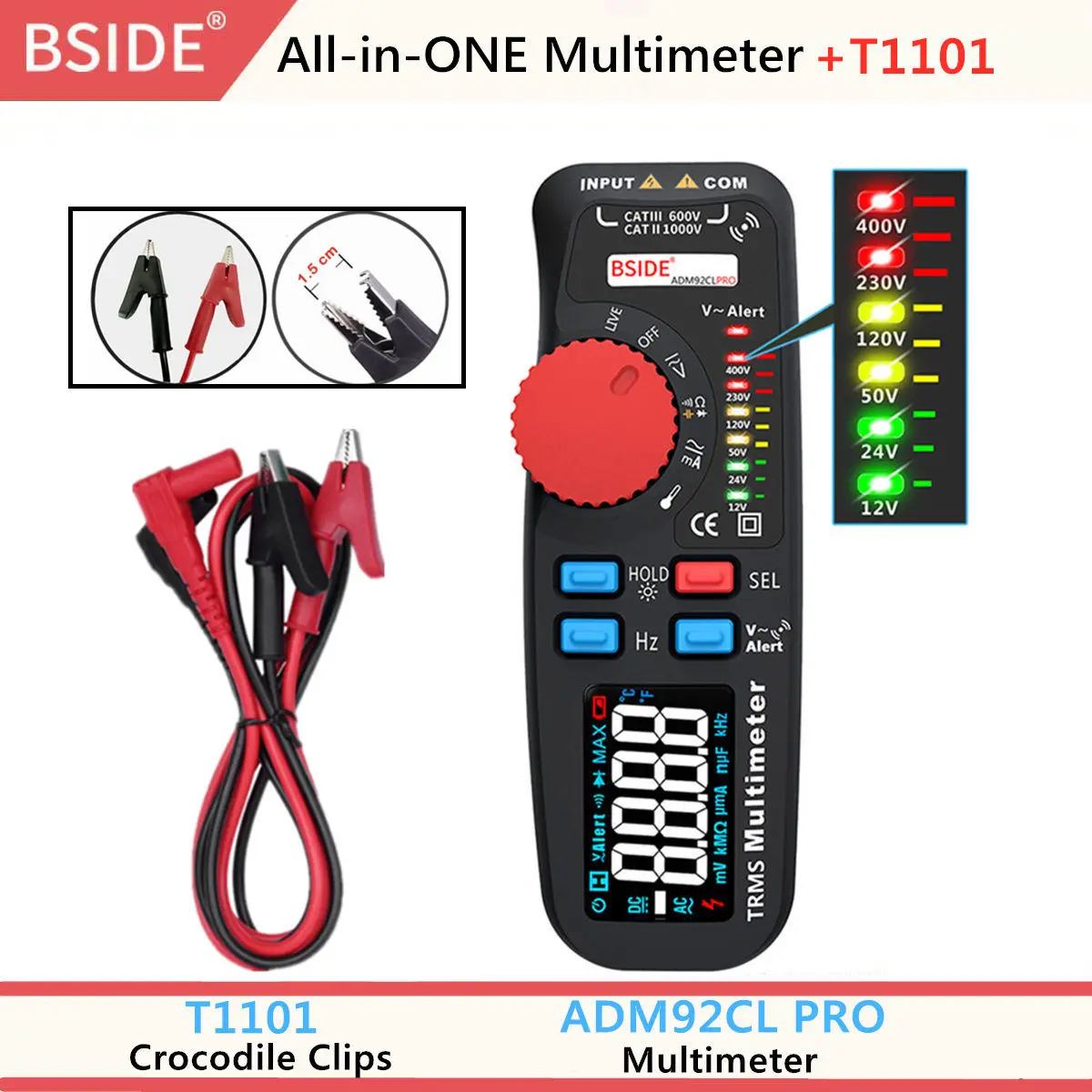 1 x мультиметр ADM92CL PRO 1 x испытательные выводы стойки CAT III 600 в 1 x зажимы типа крокодил T1101 1 термопара 1 х Защитный Водонепроницаемый чехол на шнурке. 1 x Руководство пользователя