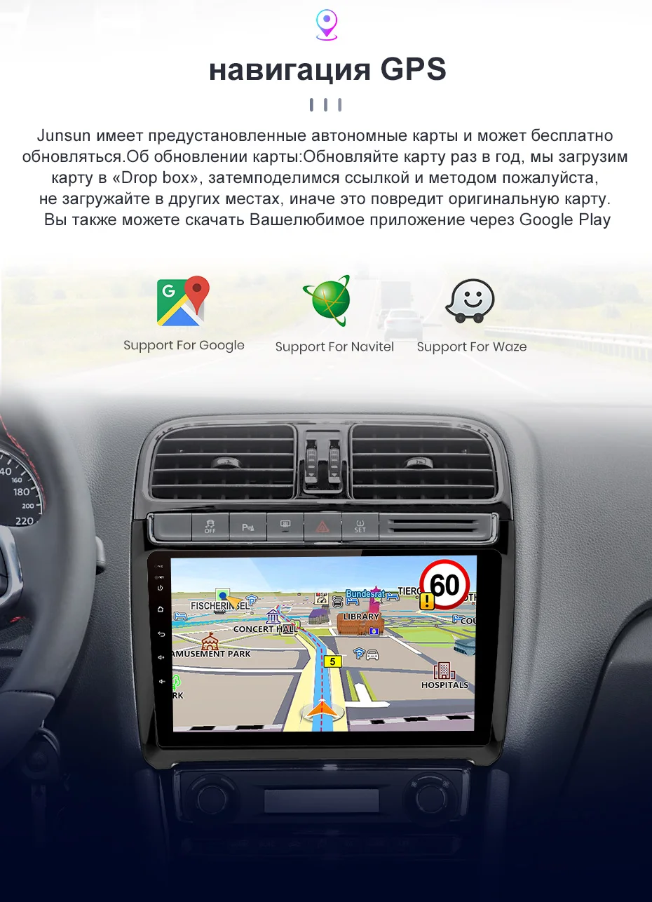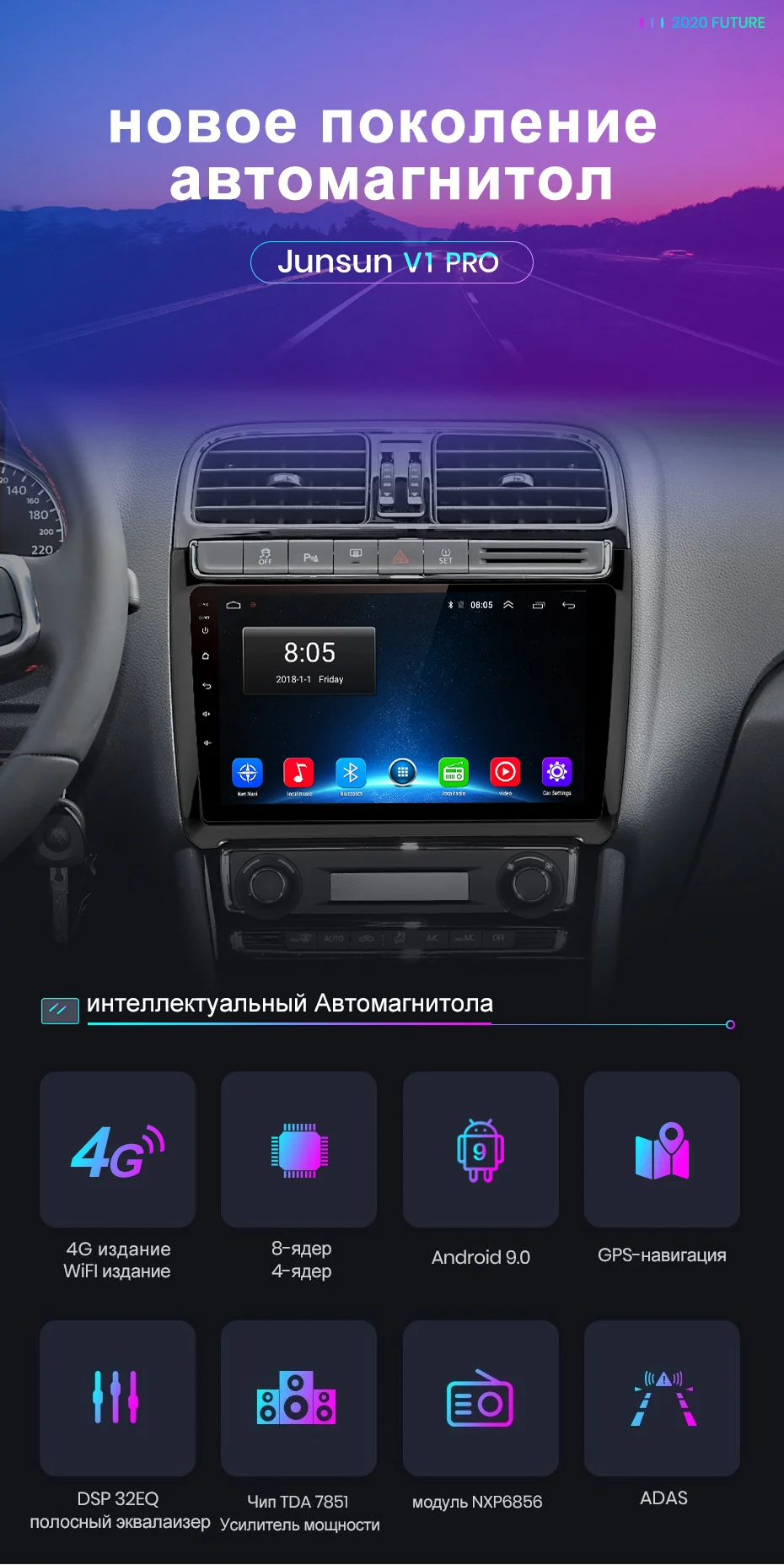 > Junsun V1 для polo sedan volkswagen функция 9 дюймов 2.5D емкостный экран + четырехъядерный процессор 1,2 ГГц + DDR3 1 Гб (2 Гб опционально) флэш + 16 Гб памяти (32 Гб опционально) + встроенный Wifi (сеть 4G опционально) + gps-навигация (бесплатное обновление карты, только Поддержка бренда Junsun) + управление рулевым колесом + зеркальная связь + Bluetooth + Встроенный микрофон + FM/AM + RDS (опционально) + Поддержка USB ADAS DVR Функция + Европа DAB функция + 1080P Vedio Play + HD 1024*600 + система мониторинга давления в шинах > 24 ч * 7 поддержка услуг В Junsun Наша цель-продолжать работать, чтобы сделать инновационное оборудование и программное обеспечение автомобильного мультимедийного Проигрывателя радио, чтобы дать вам этот персонализированный опыт. Мы предоставляем обновления для прошивки, программного обеспечения, gps-навигационных карт бесплатно.