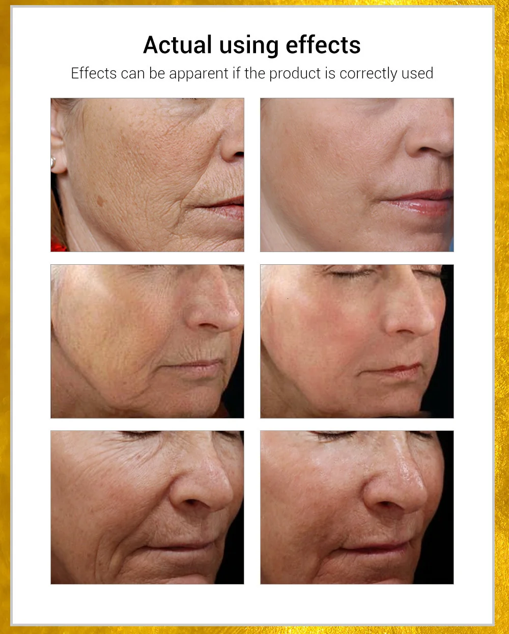 Эффекты: содержит высокие концентрации активных 99,9 золотых фольд и коллагеновых ингредиентов, он может эффективно противостоять множеству тонких линий и уменьшает морщины и старение кожи. 99,9 золото foild является антиоксидантным ингредиентом, который помогает коже анти-старения. Он может быстро проникать в кожу и активировать клетки. Кроме того, с эластичным волокном белка, его Коллаген поддерживает эластичность кожи. Функции против морщин и против старения, чтобы сохранить кожу яркой