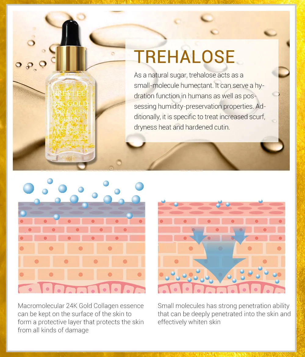 Макромолекулярная 24K Золотая коллагеновая эссенция может храниться на поверхности кожи для формирования защитного слоя, который защищает кожу от всех видов повреждений