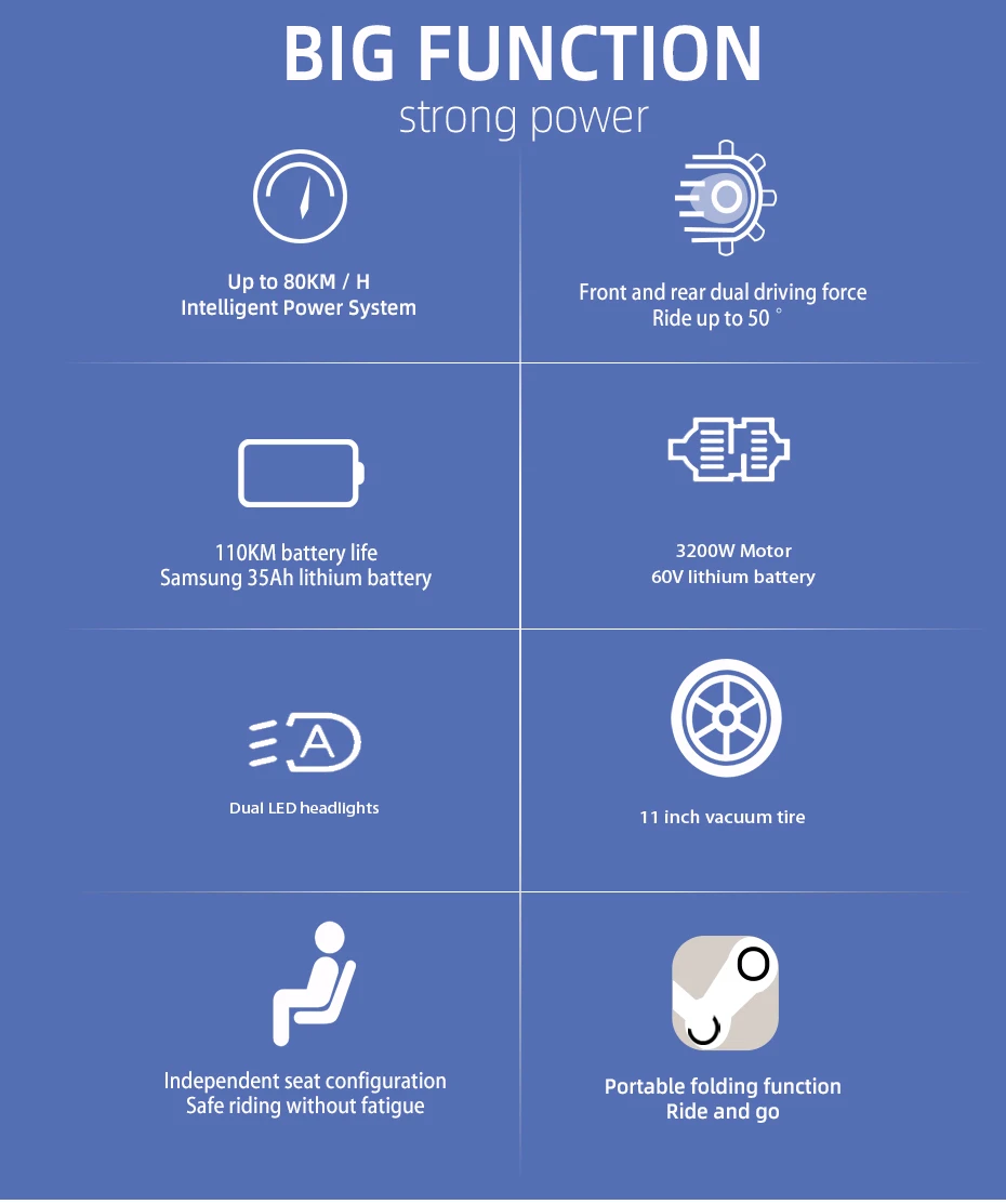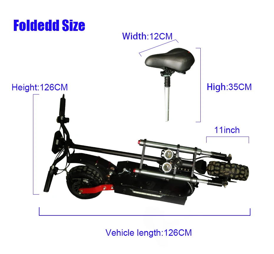 ПРИМЕЧАНИЯ по доставке: Без налога и пошлины в нижеуказанные области: (налог был предоплачен на нашей стороне) 1. Доставка в ЕС, без налога в страны Европейского союза, UPS доставим к вашей двери. 3. Без налога в Россию 4. Нет налога в США, Fedex доставим к вашей двери. Наше агентство завершит очистку для вышеуказанных стран, нет необходимости, чтобы покупатель сделал любой помощник. Расстояние 60V/2600W (1300Wx 2 мотора), двойные двигатели --- 2600W60V, 26Ah батарея, максимальная скорость 70 км/ч, может работать 75KMS --- 2600W60V, 31,5ah батарея, максимальная скорость 70 км/ч, может работать 85KMS --- 2600W60V, 30Ah батарея, Samsung Cells, максимальная скорость 70 км/ч, может работать 88KMS --- 2600W60V, 35Ah батарея, Samsung Cells, может работать скорость 70 км/ч, может работать 105KMS 60 в/3200 Вт (1600Wx 2 мотора), два мотора --- 3200W60V, 26Ah батарея, максимальная скорость 80 км/ч, может работать 70KMS --- 3200W60V, аккумулятор 31,5 Ач, максимальная скорость 80 км/ч, может работать 100 км/ч --- 3200W60V, 30Ah батарея, Samsung Cells, максимальная скорость 80 км/ч, может работать 84KMS --- 3200W60V, 35Ah батарея, Samsung Cells, может работать скорость 80 км/ч, может работать 100KMS Название продукта: 11 дюймов мощный Dualdrive Электрический скутер Двигатель: 60 в 2600 Вт (передний 1300 Вт + задний 1300 Вт, бесщеточный двигатель)/ 60 в 3200 Вт (передний 1600 Вт + задний 1600 Вт, бесщеточный двигатель, самый мощный) Максимальная нагрузка: 300 кг Вес нетто: 42-55 кг Размер колеса: 11 дюймов вакуумная Взрывозащищенная шина Емкость аккумулятора: 60 в 26AH-Samsung35Ah (литий-ионный аккумулятор) Рабочее напряжение: 60 в Максимальная скорость: 70-80 км/ч Пробег (зависит от веса дороги и водителя):70-105 км Время зарядки: 6-8 ч Угол подъема: 50 градусов Светильник: передняя лампа, задний светильник Тормоз: передние и задние зум с электронным управлением гидравлические дисковые тормоза Диаметр колес: 11 дюймов (деформация внедорожных шин, уличные шины на выбор, оставьте заметки, если вам нужна уличная шина.) Размер складывания: 1300*258*500 мм Размер посылка: 1360*325*555 мм Упаковочный лист: электрический скутер, зарядное устройство, руководство пользователя Характеристика: 1. Мощная конфигурация: 60 в 3200 Вт/2600 Вт двигатель, 26Ah-Samsung35AH 48 В литиевая батарея, двойное поглощение ударов и 11 "Пневматические шины обеспечивают большую амортизацию и противоскользящую функцию. 2. Время зарядки составляет около 2-8 часов, Максимальный ход может достигать 100 миль. Эффективная система демпфирования адаптирует этот электрический скутер, адаптируясь к дорогам различных регионов. 3. Внешний вид: яркие фары обеспечивают безопасную езду в темноте, съемные сиденья дают вам различный опыт езды, быстрый складной механизм позволяет складывать/раскладывать за считанные секунды, что делает его идеальным портативным складным электрическим скутером. 4. Примечание и напоминание: Производительность скутера может варьироваться в зависимости от веса или состояния дороги, время работы может варьироваться в зависимости от условий езды, климата и/или правильного обслуживания. Jueshuai имеет профессиональную техническую поддержку, если у вас есть какие-либо вопросы или вопросы, пожалуйста, отправьте нам сообщение.
