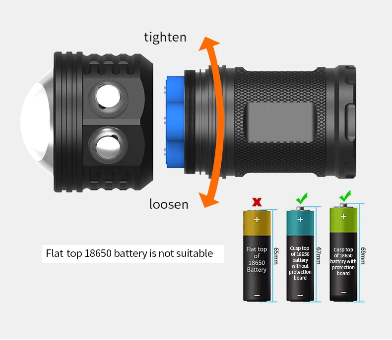 Пожалуйста, затяните лампу, чтобы она хорошо соединилась; Пожалуйста, выберите батарею 18650 с верхней головкой, аккумулятор 18650 с плоской головкой не подходит для этой лампы.