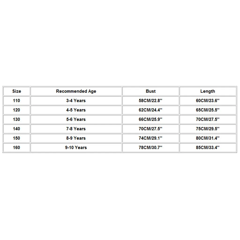| Size | Recommended Age | Bust | Length |